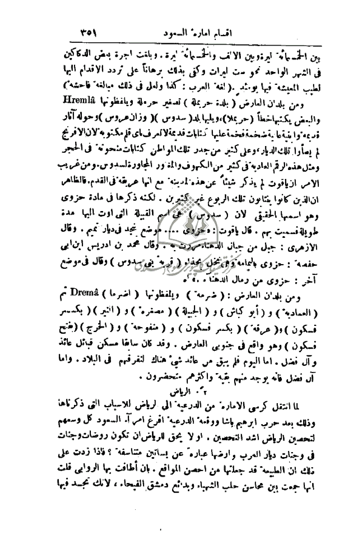 ومن بلدان العارض (بلدة حريملة) تصغير حرملة ويلفظونها والبعض يكتبها خطاً (حريملا)، ويليها بلد (سدوس) (وزان عروس) وحوله آثار قديمة وأبنية عالية ضخمة فخمة عليها كتابات قديمة لا تعرف بأي قلم مكتوبة لأن الإفرنج لك يصأوا تلك الديار، وعلى كثير من جدر تلك المواطن كتابات منحوتة في الحجر ومثل هذه الرقم العادية في كثير من الكهوف والمغور المجاورة لسدوس. ومن غريب الأمر إن ياقوت لم يذكر شيئاً عن هذه المدينة مع أنها عريقة في القدم. فالظاهر إن الذين كانوا ينتابون تلك الربوع غير كثيرين. لكنه ذكرها في مادة حزوى وهو أسمها الحقيقي لأن (سدوس) هي اسم القبيلة التي أوت إليها مدة طويلة فسميت بهم. قال ياقوت: (حزوى. . . . موضع بنجد في ديار تميم. وقال الأزهري: جبل من جبال الدهناء مررت به. وقال محمد بن إدريس ابن أبي حفصة: حزوى باليمامة وهي نخل بحذاء (قرية بني سدوس) وقال في موضع آخر: حزوى من رمال الدهناء.) اهـ