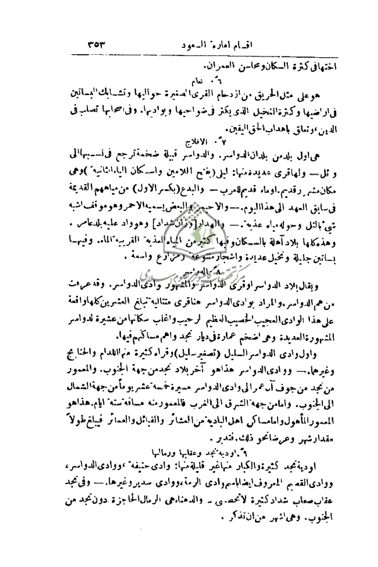 وأول وادي الدواسر السليل (تصغير سليل) وقراه كثيرة منها اللدام والحنابج وغيرهما. - ووادي الدواسر هذا هو آخر بلاد من جهة الجنوب. والمعمور من نجد من جوف آل عمر إلى وادي الدواسر مسيرة خمسة عشر يوماً من جهة الشمال إلى الجنوب. وأما من جهة