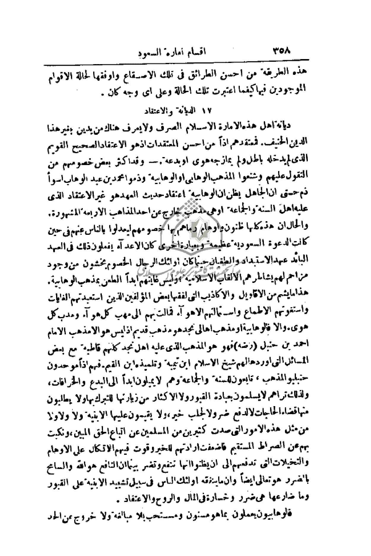 ديانة أهل هذه الإمارة الإسلام الصرف ولا يعرف هناك من يدين بغير هذا الدين الحنيف. فمعتقدهم إذا من احسن المعتقدات إذ هو الاعتقاد الصحيح القويم الذي لم يدخله باطل ولم يمازجه هوى أو بدعة. - وقد أكثر بعض خصومهم من التقول عليهم وشنعوا المذهب الوهابي أو الوهابية وذموا محمد بن عبد الوهاب أسوأ ذم حتى أن الجاهل يظن إن الوهابية اعتقاد حديث العهد هو غير الاعتقاد الذي عليه أهل السنة والجماعة أو هي مذهب خارج عن أحد المذاهب الأربعة المشهورة. والحال إن هذه كلها ظنون وأوهام رماهم بها خصومهم ليعدلوا بالناس عنهم في حين كانت العدوة السعودية عظيمة وبعبارة أخرى كان الأعداء يفعلون ذلك في العهد البائد عهد الاستبداد والطغيان حينما كان أولئك الرجال الخصوم يخشون من وجود مزاحم لهم يشاطرهم الألقاب الإسلامية؛ وليس غايتهم أبداً الطعن بمذهب الوهابية. هذا ما يشم من الأقاويل والأكاذيب التي لفقها بعض المؤلفين الذين استعبدتهم الغايات واستغوتهم الأطماع واستمالتهم الأهواء فمالت بهم إلى مهب كل هواء ومدب كل هوى. وإلا فالوهابية أو مذهب أهالي نجد هو مذهب قديم إذ ليس هو إلا مذهب الإمام أحمد بن حنبل (رضه) فهو هو المذهب الذي عليه أهل نجد كلهم قاطبة مع بعض المسائل التي أوردها لهم الشيخ الإسلام ابن تيمية وتلميذه ابن القيم. فهم إذا موحدون حنبليو المذهب، تابعون للسنة والجماعة وهم لا يميلون أبداً إلى البدع والخرافات، ولذلك تراهم لا