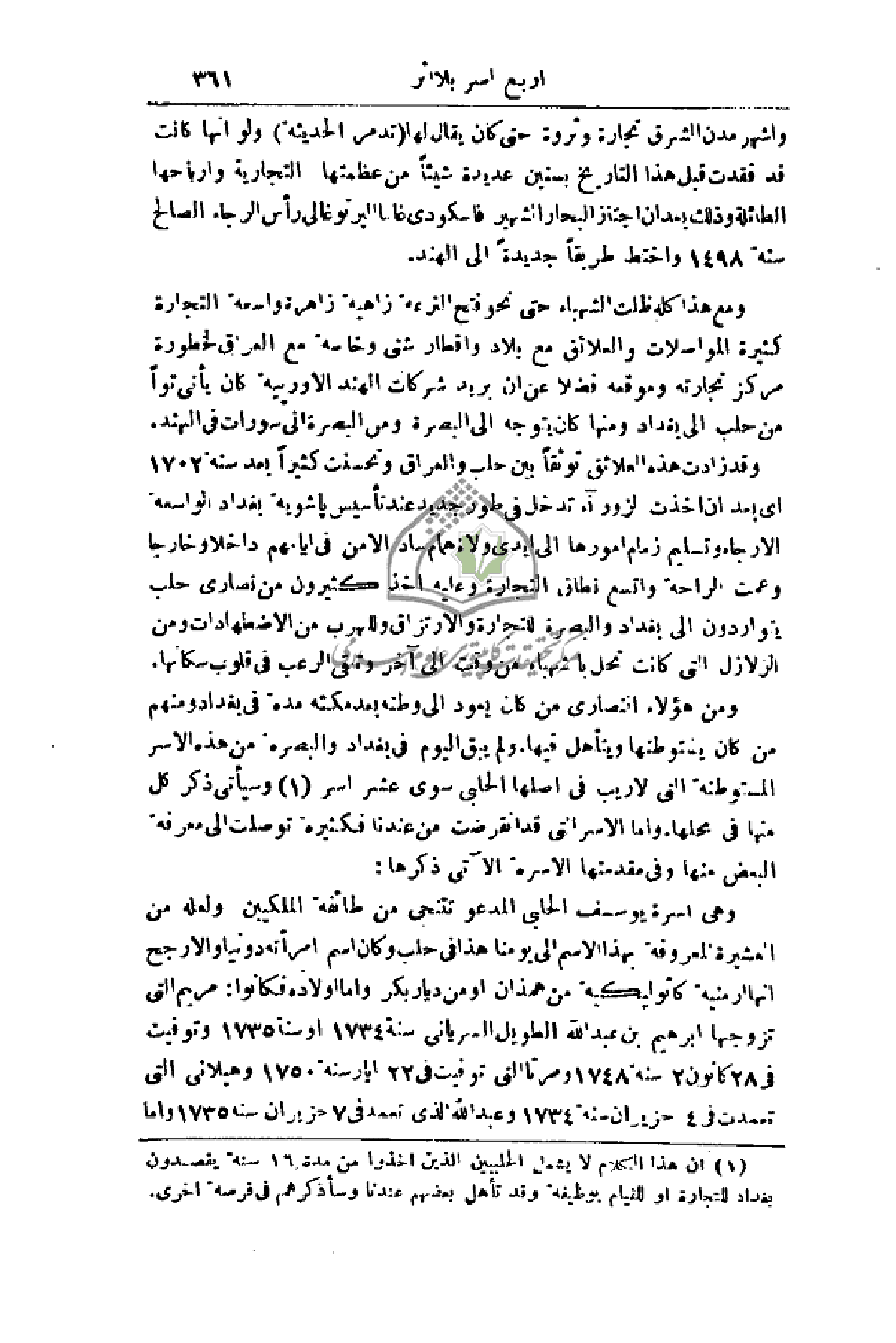 ومن هؤلاء النصارى من كان يعود إلى وطنه بعد مكثه مدة في بغداد ومنهم من كان يستوطنها ويتأهل فيها. ولم يبق اليوم في بغداد والبصرة من هذه الأسر المستوطنة التي لا ريب في أصلها الحلبي سوى عشر أسر وسيأتي ذكر كل منها في محلها. وأما الأسر التي قد انقرضت من عندنا فكثيرة توصلت إلى معرفة البعض منها وفي مقدمتها الأسرة الآتي ذكرها: