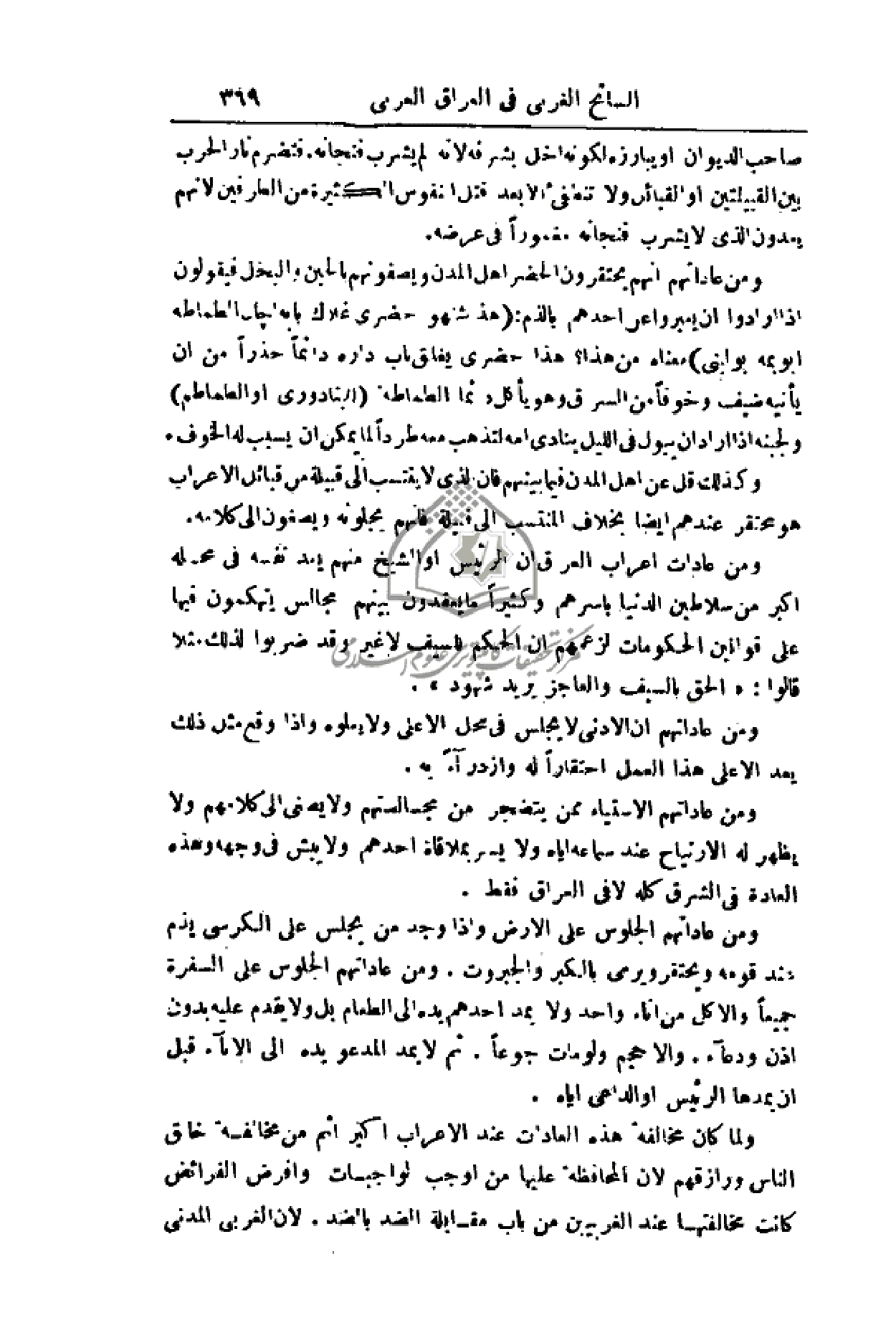 ومن عاداتهم الاستياء ممن يتضجر من مجالستهم ولا يصغي إلى كلامهم ولا يظهر له الارتياح عند سماعه إياه ولا يسر بملاقاة أحدهم ولا يبش في وجهه وهذه العادة في الشرق كله لا في العراق فقط.
