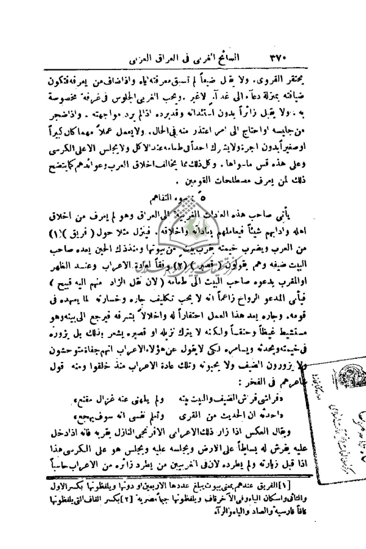 يأتي صاحب هذه العادات الغربية إلى العراق وهو لم يعرف من أخلاق أهله وآدابهم شيئاً فيعاملهم بعاداته وأخلاقه. فينزل مثلا حول (فريق) من العرب ويضرب خيمته بقرب بيتٍ من بيوتها ومنذ ذاك الحين يعده صاحب البيت ضيفه وهم يقولون (قصير) وفقاً لعادة الأعراب وعند الظهر أو المغرب يدعوه صاحب البيت إلى طعامه (لأن نقل الزاد منهم إليه قبيح) فيأتي المدعو الرواح زاعماً إنه لا يحب تكليف جاره وخسارته لما يعده في قومه. وجاره يعد هذا العمل احتقاراً له وإخلالا بشرفه فيرجع إلى بيته وهو مستشيط غيظاً وحنقاً ولكنه لا يترك نزيله أو قصيره يشعر بذلك بل يزوره في خيمته ويحدثه ويسامره لكي لا يقول عن هؤلاء الأعراب أنهم جفاة متوحشون ولا يزورون الضيف ولا يحبونه وتلك عادة الأعراب منذ خلقوا) منه قول شاعرهم في الفخر: