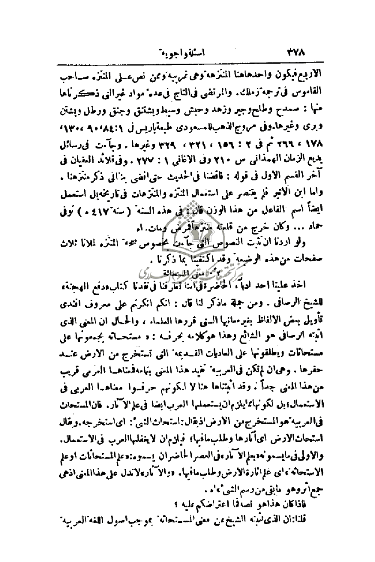 الربع فيكون واحدها هنا المنتزهة وهي غريبة وممن نص على المنتزه صاحب القاموس في ترجمة زملك. والمرتضى في التاج في عدة مواد غير التي ذكرناها منه: صمدح وطلح وجير وزهد وحبش وسيط ويشتنق وجنق ورطل وبشتن وبري وغيرها. وفي مروج الذهب للمسعودي طبعة باريس في 1: 84، 90، 130، 178، 266 ثم في 2: 156، 321، 329 وغيرها. وجاءت في رسائل بديع الزمان الهمذاني ص 210 وفي الأغاني 1: 277. وفي قلائد العقيان في أخر القسم الأول في قوله: فأفضنا في الحديث حتى أفضى بنا إلى