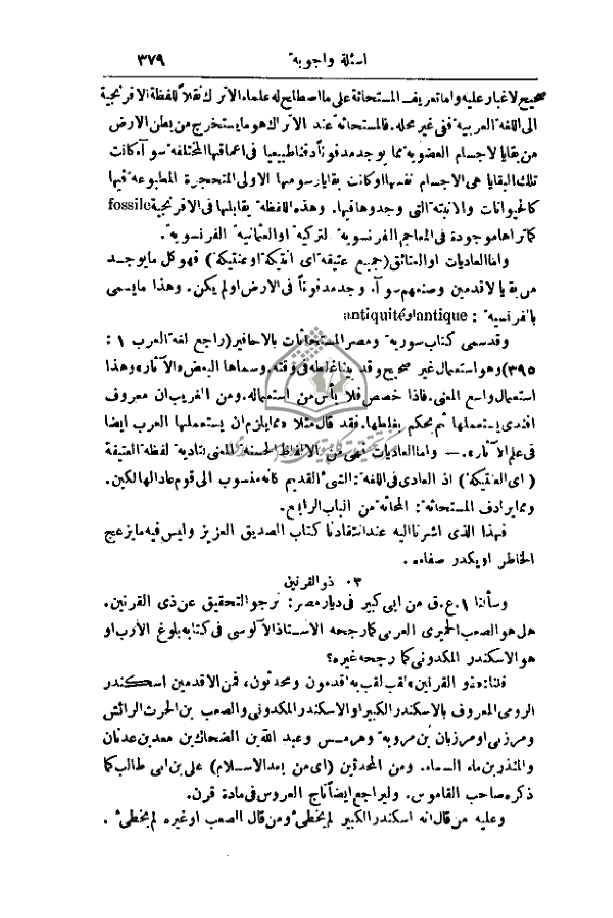 وقد سمى كتاب سورية ومصر المستحاثات بالأحافير (راجع لغة العرب 1: 395) وهو استعمال غير صحيح وقد بينا غلطه في وقته. وسماها البعض (الآثار) وهذا استعمال واسع المعنى. فإذا خصص فلا بأس من استعماله. ومن الغريب أن معروف أفندي يستعملها ثم يحكم بغلطها. فقد قال مثلا (مما يلزم أن يستعملها العرب أيضاً في علم الآثار). - وأما العاديات فهي من الألفاظ الحسنة المعنى لتأدية لفظة العتيقة (أي العنتيكة) إذ العادي في اللغة: الشيء القديم كأنه منسوب إلى قوم عاد الهالكين. ومما يرادف المستحاثة: المحاثة من الباب الرابع.
