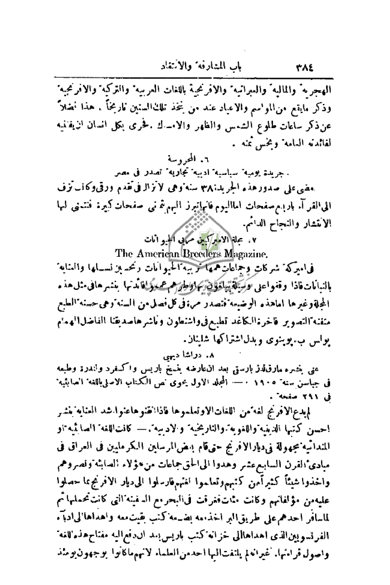 في أميركا شركات وجماعات همها تربية الحيوانات وتحسين نسلها والعناية بالنباتات فإذا وقفوا على وسيلة يبلغون بها وطرهم عمموا فائدتها بنشرها في مثل هذه المجلة وغيرها أما هذه الوضعية فتصدر مرة في كل فصل من السنة وهي حسنة الطبع متقنة التصوير فاخرة الكاغد تطبع في واشنطون وناشرها صديقنا الفاضل الهمام بولس ب. بوبنوى وبدل اشتراكها شلينان.