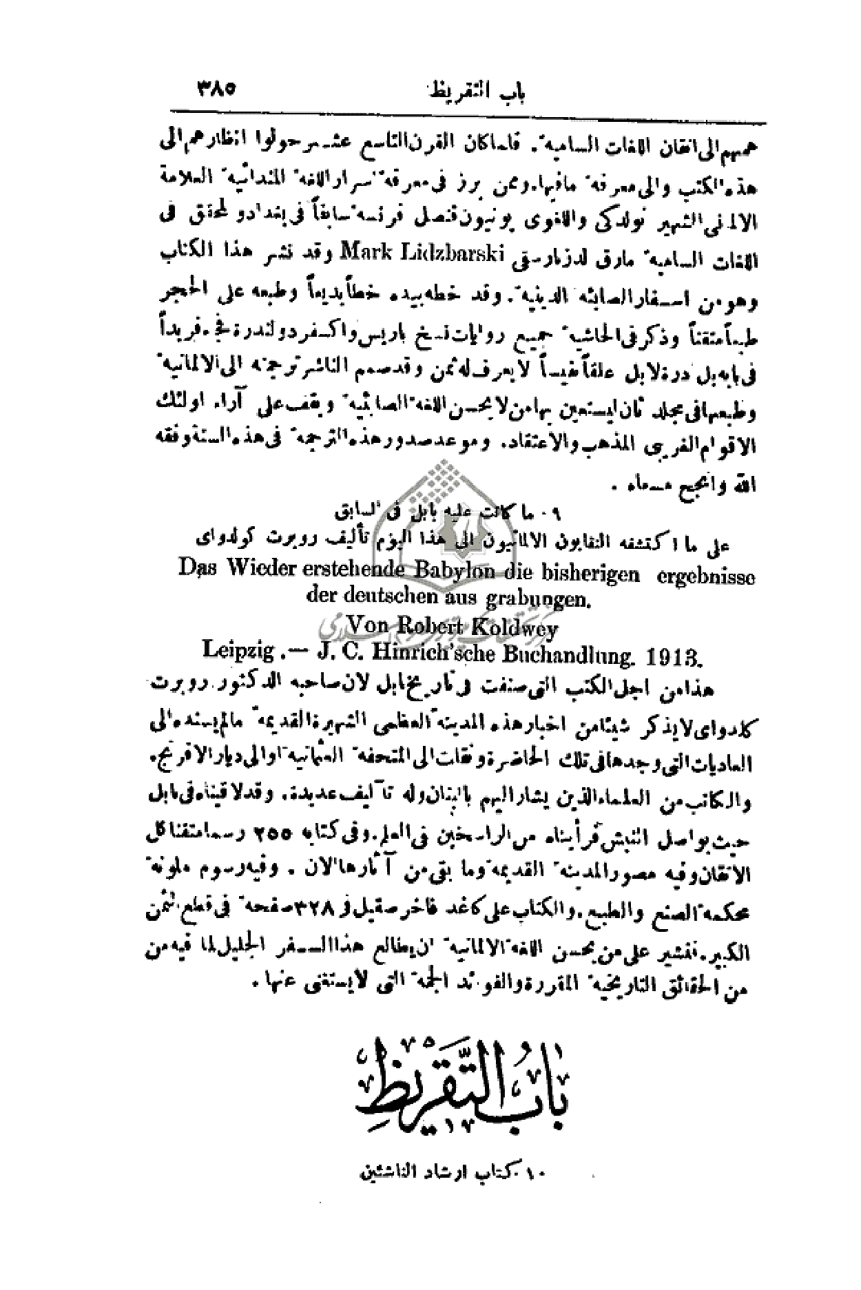 هذا من أجل الكتب التي صنفت في تاريخ بابل لأن صاحبه الدكتور روبرت كلدواي لا يذكر شيئاً من أخبار هذه المدينة العظمى الشهيرة القديمة ما لم يسنده إلى العاديات التي وجدها في تلك الحاضرة ونقلت إلى المتحفة العثمانية أو إلى ديار الإفرنج. والكاتب من العلماء الذين يشار إليهم بالبنان وله تأليف عديدة. وقد لاقيناه في باتل حيث يواصل النبش فرأيناه من الراسخين في العلم. وفي كتابه 255 رسما متقنا كل الإتقان وفيه مصور المدينة القديمة وما بقي من آثارها الآن. وفيه رسوم ملونة محكمة الصنع والطبع. والكتاب على كاغد فاخر صقيل في 328 صفحة في قطع الثمن الكبير. فنشير على من يحسن اللغة الألمانية أن يطالع هذا السفر الجليل لما فيه من منن الحقائق التاريخية المقررة والفوائد