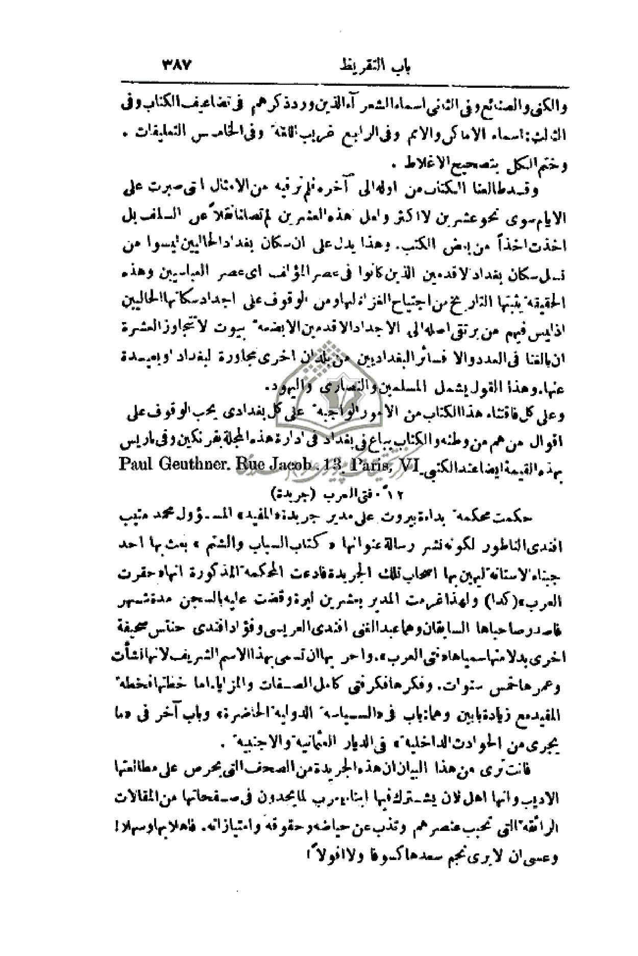 وعلى كل فاقتناء هذا الكتاب من الأمور الواجبة على كل بغدادي يحب الوقوف على أقوال من هم من وطنه والكتاب يباع في بغداد في إدارة هذه المجلة بفرنكين وفي باريس بهذه القيمة أيضاً عند كتبي 13.