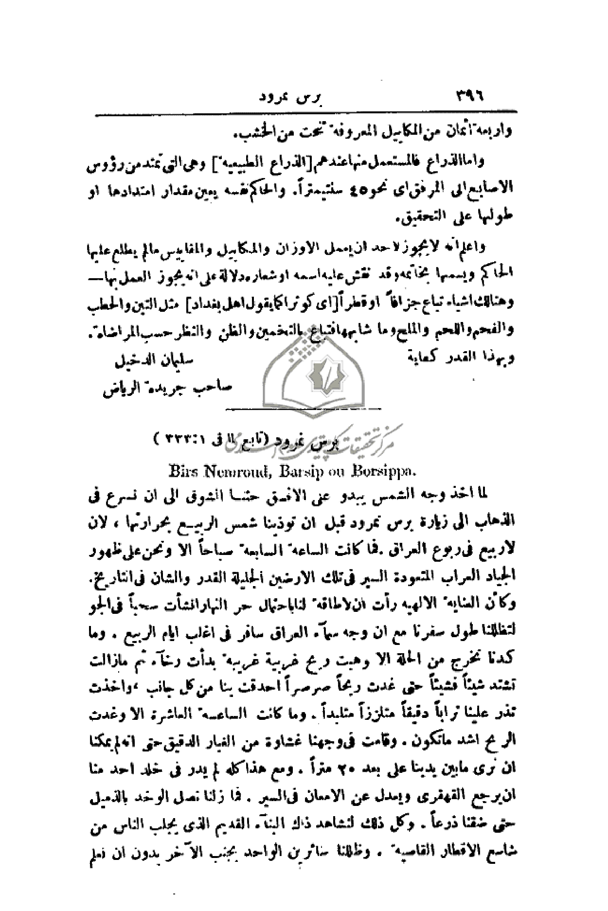 لما أخذ وجه الشمس يبدو على الأفق حثنا الشوق إلى أن نسرع في الذهاب إلى زيارة برس نمرود قبل أن تؤذينا شمس الربيع بحرارتها، لأن لا ربيع في ربوع العراق. فما كانت الساعة السابعة صباحاً إلا ونحن على ظهور الجياد العراب المتعودة السير في تلك الأرضيين الجليلة القدر والشان في التاريخ وكأن العناية الإلهية رأت أن لا طاقة لنا باحتمال حر النهار أنشأت سحباً في الجو لتظلنا طول سفرنا مع أن وجه سماء العراق سافر في اغلب أيام الربيع. وما كدنا نخرج من الحلة إلا وهبت ريح غربية غريبة بدأت رخاء ثم ما زالت تشتد شيئاً فشيئاً حتى غدت ريحاً صرصراً حدقت بنا من كل جانب، وأخذت تذر علينا تراباً دقيقاً متلززاً متلبداً. وما كانت الساعة العاشرة إلا وغدت الريح أشد ما تكون. وقامت في وجهنا غشاوة من الغبار الدقيق حتى أنه لم يمكنا أن نرى ما بين يدينا على بعد 20 مترا. ومع هذا كله لم يدر في خلد أحدا منا أن يرجع القهقرى ويعدل عن الإمعان في السير. فما زلنا نصل الوخد بالذميل حتى ضقنا ذرعاً. وكل ذلك لنشاهد ذك البناء القديم الذي يجلب الناس من شاسع الأقطار القاصية. وظللنا سائرين الواحد بجنب الآخر بدون أن نعلم