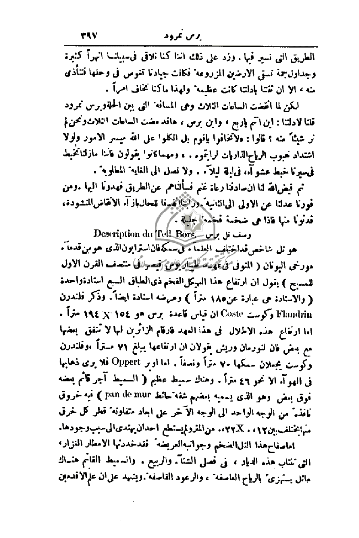 هو تل شاخص قد اختلف العلماء في سمكه فإن استرابون الذي هو من قدماء مؤرخي اليونان (المتوفى في عهد طيباربوس قيصر في منتصف القرن الأول للمسيح) يقول إن ارتفاع هذا الهيكل الفخم ذي الطباق السبع استادة واحدة (والاستادة هي عبارة عن 185 متراً) وعرضه استادة أيضاً. وذكر فلندرن أن قياس قاعدة برس هو 154 في 194 متراً. أما ارتفاع هذه الأطلال في هذا العهد فأرقام الزائرين لها لا تتفق بعضها مع بعض فإن لنورمان وريش يقولان أن ارتفاعها يبلغ 71 متراً، وفلندرن وكوست يجعلان سمكها 70 متراً ونصفاً. أما أوبر فلا يرى ذهابها في الهواء إلا نحو 46 متراً. وهناك سميط عظيم (السميط آجر قائم بعضه فوق بعض وهو الذي يسميه بعضهم شقة حائط فيه خروق نافذة من الوجه الواحد الآخر على أبعاد متفاوتة قطر كل خرق منها يختلف بين 12،. من المتر ولم يستطع أحد أن يهتدي إلى سبب وجودها.