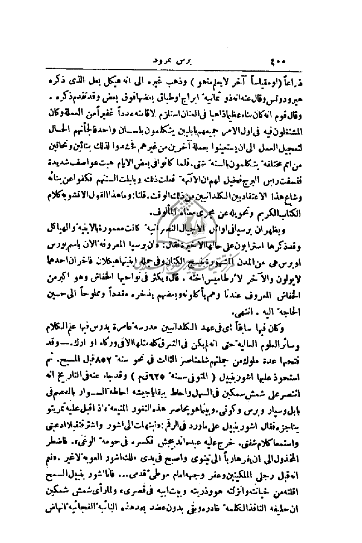 ذراعاً (أو مقياساً آخر لا يعلم ما هو) وذهب غيره إلى أنه هيكل بعل الذي ذكره هيرودوتس وقال عنه أنه ذو ثمانية أبراج أو طباق بعضها فوق بعض وقد تقدم ذكره. وقال قوم أنه كان بناء عظيما ذاهبا في العنان استلزم لأقامته عدداً غفيراً من العملة وكان المشتغلون فيه في أول الأمر جميعهم بابليين يتكلمون بلسان واحد فألجأتهم الحال لتعجيل العمل إلى أن يستعينوا بعملة آخرين من غيرهم فحشدوا لذلك بنائين ونحاتين من أمم مختلفة يتكلمون بألسنة شتى. فلما كانوا في بعض الأيام هبت عواصف شديدة فنسفت رأس البرج فخيل لهم أن الآلهة فعلت ذلك وبلبلت ألسنتهم فكفوا عن بنائه وشاع هذا الاعتقاد بين الكلدانيين من ذلك الوقت. قلنا: وما هذا القول إلا تشوبه كلام الكتاب الكريم وتحويله عن مجرى معناه المألوف.