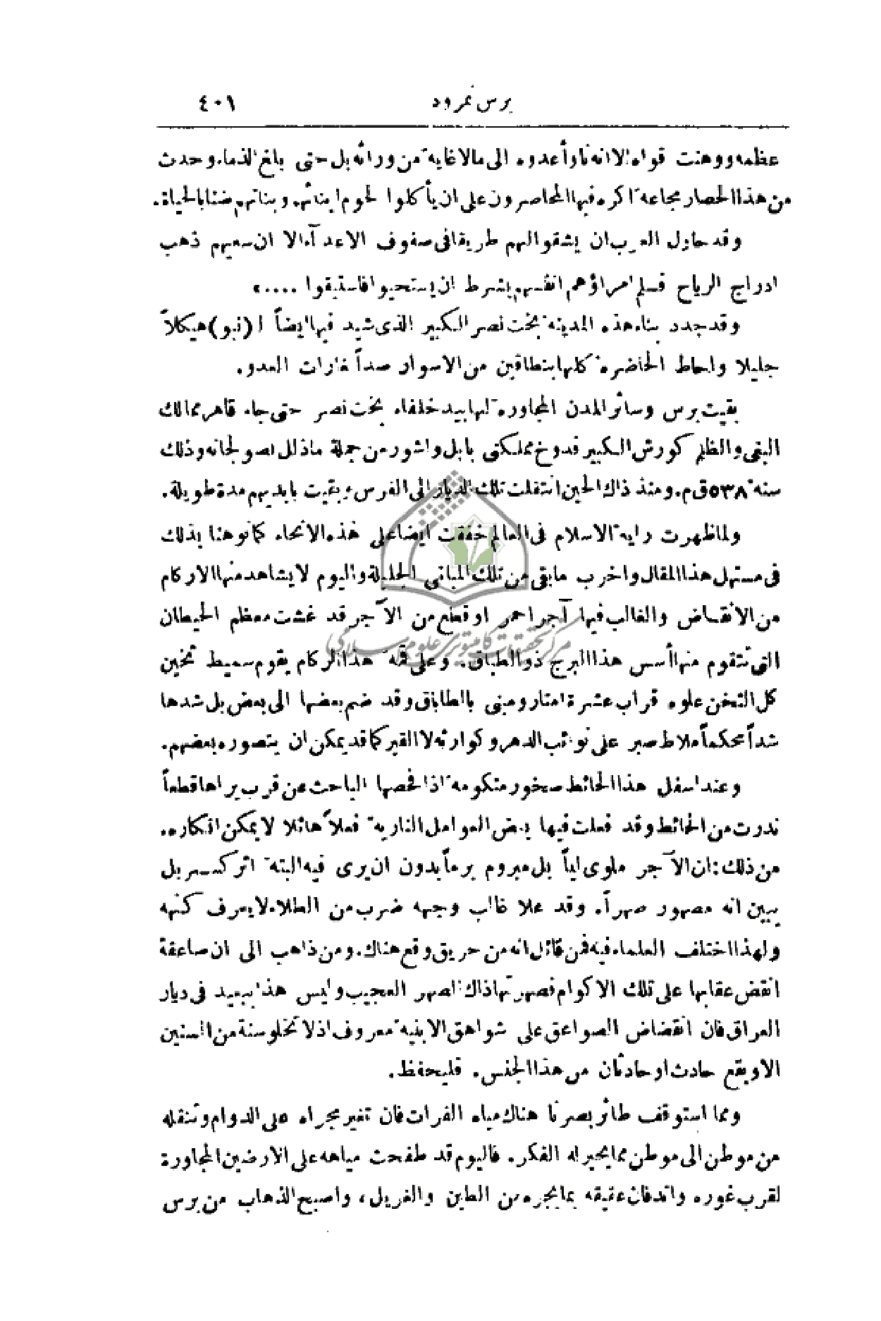 مستهل هذا المقال وأخرب ما بقي من تلك المباني الجليلة واليوم لا يشاهد منها إلا ركام من الأنقاض والغالب فيها آجر أحمر أو قطع من الآجر قد غشت معظم الحيطان التي تتقوم منها أسس هذا البرج ذو الطباق. وعلى قمة هذا الركام يقوم سميط ثخين كل الثخن علوه قراب عشرة أمتار ومبني بالطاباق وقد ضم بعضها إلى بعض بل شدها شداً محكماً ملاط صبر علة نوائب الدهر وكوارثه لا القير كما قد يمكن أن يتصوره بعضهم.