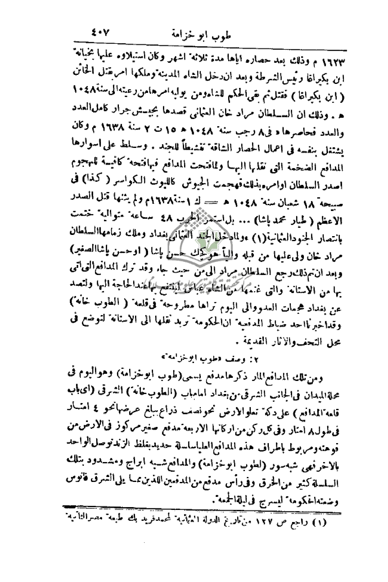 1623م وذلك بعد حصاره إياها مدة ثلاثة أشهر وكان استيلاؤه عليها بخيانة ابن بكير رئيس الشرطة وبعد أن دخل الشاه المدينة وملكها أمر بقتل الخائن (ابن بكير أغا) فقتل ثم بقى الحكم للشاه ومن يوليه أمرها من رعيته إلى سنة 1048هـ. وذلك أن السلطان مراد خان العثماني قصدها بجيش جرار كامل العدد والعدد فحاصرها (في 8 رجب سنة 1048هـ 15 ت 2 سنة 1638م وكان يشتغل بنفسه في أعمال الحصار الشاقة تنشيطاً للجند. وسلط على أسوارها المدافع الضخمة التي نقلها إليها ولما فتحت المدافع فيها فتحة كافية للهجوم أصدر السلطان أوامره بذلك فهجمت الجيوش كالليوث الكواسر (كذا) في صبيحة 18 شعبان سنة 1048هـ - ك1 1638م ولم يثنها قتل الصدر الأعظم (طيار محمد باشا). . . بل استمر الحرب 48 ساعة متوالية ختمت بانتصار الجنود العثمانية) ولما دخل الجند العثماني بغداد وملك زمامها السلطان مراد خان ولى عليها من قبله والياً هو كجك حسن باشا (أو حسن باشا الصغير) وبعد أن تم ذلك رجع السلطان مراد إلى من حيث جاء وقد ترك المدافع التي أتى بها من الأستانة والتي غنمها من الشاه عباس لينتفع بها عند الحاجة إليها ولتصد عن بغداد هجمات العدو وإلى اليوم تراها مطروحة في قلعة (الطوب خانة) وقد أخبرنا أحد ضباط المدفعية أن الحكومة تريد نقلها إلى الأستانة لتوضع في محل التحف والآثار القديمة.