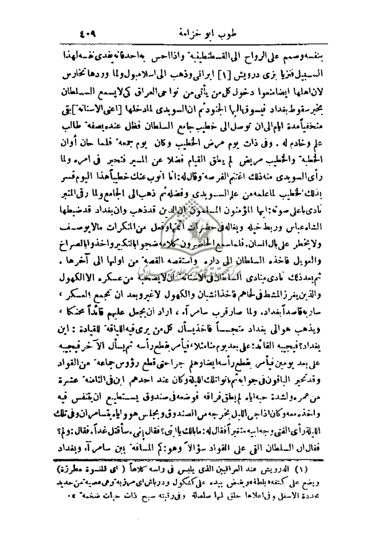 بنفسه وصمم على الرواح إلى القسطنطينية وإذا أحس به أحد فإنه يفدي نفسه لهذا السبيل فتزيا بزي درويش إيراني وذهب إلى إسلامبول ولما وردها تخارس لأن أهلها أيضاً منعوا دخول كل من يأتي من نواحي العراق كي لا يسمع السلطان بخبر سقوط بغداد فيسوق إليها الجنود ثم أن السويدي لما دخلها (أعني الأستانة) بقي متخفياً مدة أيام إلى أن توصل إلى خطيب جامع السلطان فظل عنده بصفة طالب علم وخادم له. وفي ذات يوم مرض الخطيب وكان يوم جمعة فلما حان أوان الخطبة والخطيب مريض لم يطق القيام فضلاً عن المسير فتحير في أمره ولما رأى السويدي منه ذلك اغتنم الفرصة وقال له: أنا أنوب عنك خطيباً هذا اليوم فسر بذلك الخطيب لما علمه من علم السويدي وفضله ثم ذهب إلى الجامع ولما رقى المنبر نادى بأعلى صوته: أيها المؤمنون المسلمون إن الدين قد ذهب وإن بغداد قد ضبطها الشاه عباس وربط خيله وبغاله في حضرات أئمتها وفعل من المنكرات مالا يوصف ولا يخطر على بال إنسان. فلما سمع الحاضرون كلامه ضجوا بالتكبير وأخذوا بالصراخ والعويل فأخذه السلطان إلى داره وأستقصه القصة من أولها إلى آخرها. ثم بعد ذلك نادى منادي السلطان في الأستانة أن لا يصحبه من عسكره إلا الكهول والذين يغرز المشط في لحاهم فأخذ الشبان والكهول لا غير وبعد أن تجمع العسكر، سار به قاصداً بغداد. ولما صار قرب سامراء، أراد أن يجعل عليهم قائداً محنكاً، ويذهب هو إلى بغداد متجسساً فأخذ يسأل كل من يرى فيه اللياقة للقيادة: أين بغداد؟ فيجيبه القائد: على بعد يوم منا مثلا، فيأمر بقطع رأسه ثم يسأل الآخر فيجيبه على بعد يومين فيأمر بقطع رأسه أيضاً وهلم جرا حتى قطع رؤوس جماعة من القواد وقد تحير الباقون في جوابه ثم باتوا تلك الليلة وكان عند أحدهم ابن في الثامنة عشرة من عمره ولشدة حبه إياه لم يطق فراقه فوضعه في صندوق يستطيع أن يتنفس فيه وأخذه معه وكان إذا جن الليل يخرجه من الصندوق ويجلس هو وإياه يتسامران وفي تلك الليلة رأى الفتى وجه أبيه متغيراً فقال له: ما بالك يا أبتي؟ فقال إني. سأقتل غداً. فقال: ولم؟ فقال إن السلطان ألقى على القواد سؤالاً وهو: كم المسافة بين سامراء وبغداد