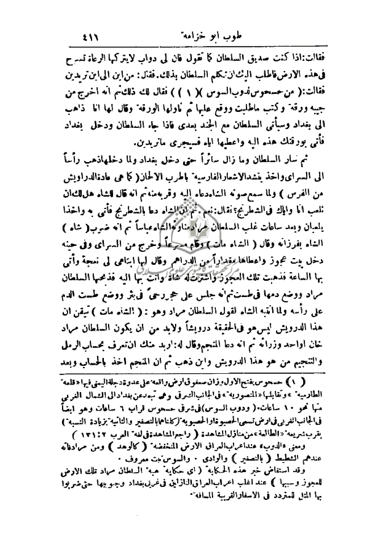 فأطلب إليك أن تكلم السلطان بذلك. فقال: من أين إلى أين تريدين فقالت: (من حسحوس لدوب السوس) فقال لك ذلك ثم أنه أخرج من جيبه ورقة وكتب ما طلبت ووقع عليها ثم ناولها الورقة وقال لها أنا ذاهب إلى بغداد وسيأتي السلطان مع الجند بعدي فإذا جاء السلطان ودخل بغداد فأتى بورقتك هذه إليه وأعطيها إياه فسيجري ما تريدين.