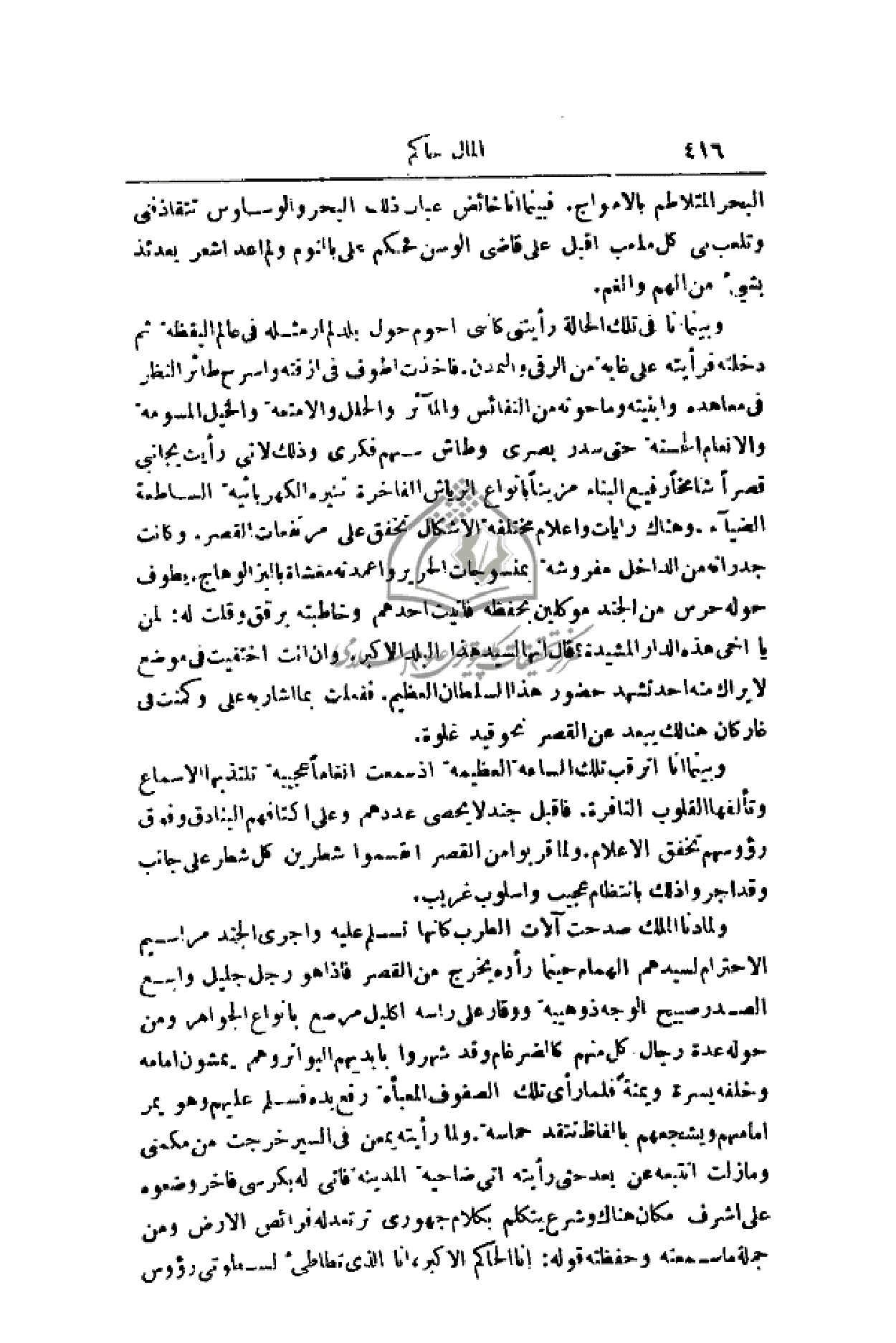 وبينما أنا في تلك الحالة رأيتني كأنني أحوم حول بلد لم أر مثله في عالم اليقظة ثم دخلته فرأيته على غابة من الرقي والتمدن. فأخذت أطوف في أزقته وأسرح طائر النظر في معاهده وأبنيته وما حوته من النفائس والمآثر والحلل والأمتعة والخيل المسومة والأنعام الحسنة حتى سدر بصري وطاش سهم فكري وذلك لأني رأيت بجانبي قصراً شامخاً رفيع البناء مزيناً بأنواع الرياش الفاخرة تنيره الكهربائية الساطعة الضياء. وهناك رايات وأعلام مختلفة الأشكال تخفق على مرتفعات القصر. وكانت جدرانه من الداخل مفروشة بمنسوجات الحرير وأعمدته مغشاة بالبز الوهاج. يطوف حوله حرس من الجند موكلين بحفظه فأتيت أحدهم وخاطبته برفق وقلت له: لمن يا أخي هذه الدار المشيدة؟ قال إنها لسيد هذا البلد الأكبر. وإن أنت اختفيت في موضع لا يراك منه أحد تشهد حضور هذا السلطان العظيم. ففعلت بما أشار به عليّ وكمنت في غار كان هنالك يبعد عن القصر نحو قيد غلوة.