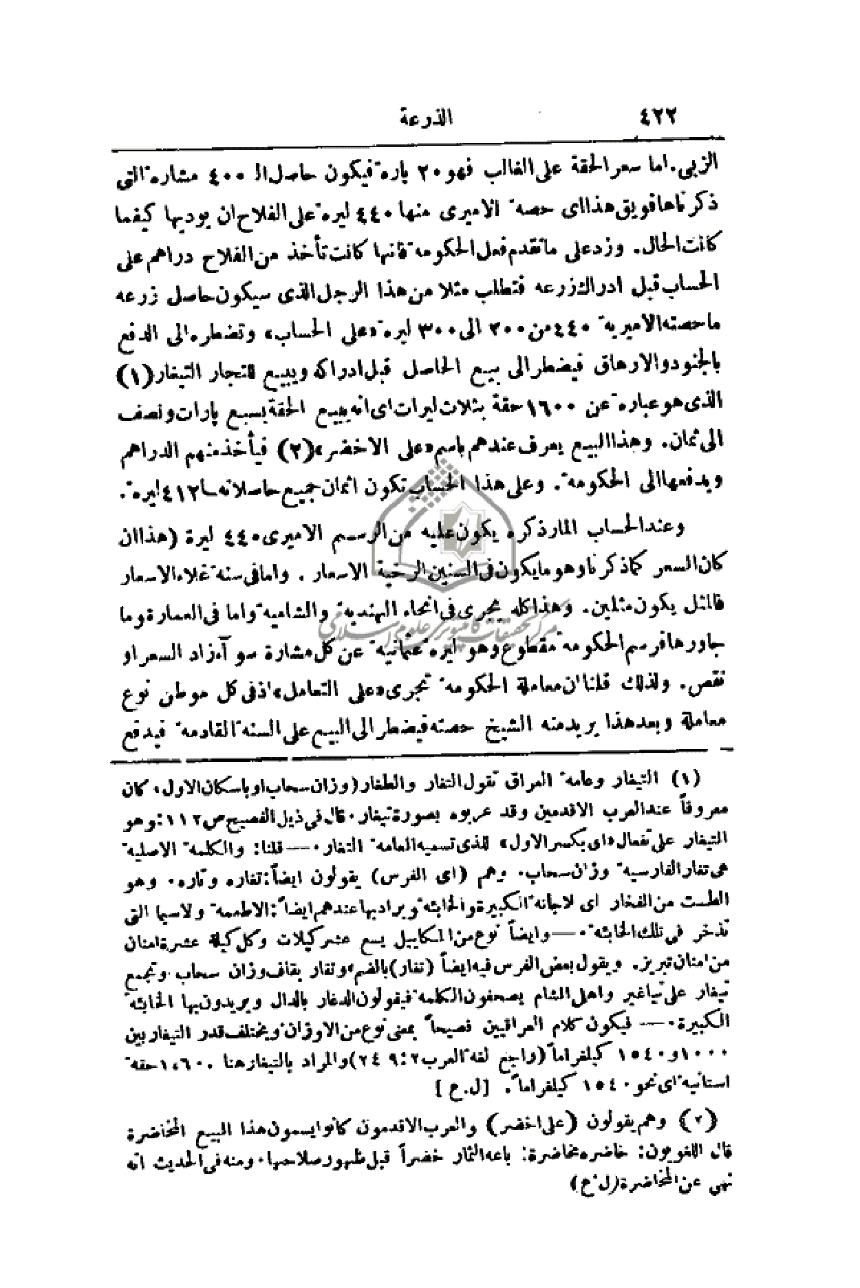 وعند الحساب المار ذكره يكون عليه من الرسم الأميري 440 ليرة (هذا إن كان السعر كما ذكرنا وهو ما يكون في السنين الرخية الأسعار. وأما في سنة غلاء الأسعار فالمثل يكون مثلين. وهذا كله يجري في أنحاء الهندية والشامية وأما في العمارة وما جاورها فرسم الحكومة مقطوع وهو ليرة عثمانية عن كل مشارة سواء زاد السعر أو نقص. ولذلك قلنا أن معاملة الحكومة تجري (على التعامل) إذ في كل موطن نوع معاملة وبعد هذا يريد منه الشيخ حصته فيضطر إلى البيع على السنة القادمة فيدفع