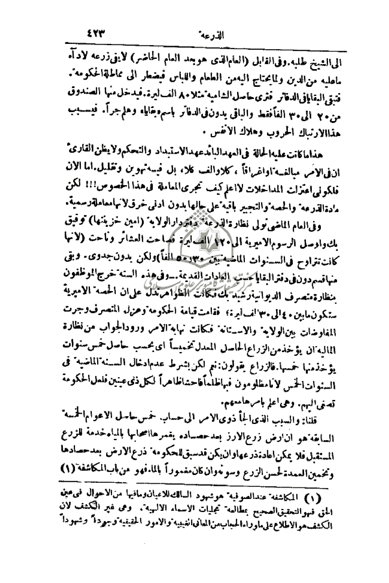 وفي العام الماضي تولى نظارة الذرعة دفتر دار الولاية (أمين خزينتها) توفيق بك وأوصل الرسوم الأميرية إلى 120 ألف ليرة فصاحت العشائر وناحت (لأنها كانت تتراوح في السنوات الماضية بين 30 و50 ألفاً) ولكن بدون جدوى. وبقي منها قسم دون في دفتر البقايا حسب العادات القديمة. - وفي هذه السنة خرج الموظفون بنظارة متصرف الديوانية رشيد بك فكانت الظواهر تدل على أن الحصة الأميرية ستكون ما بين 40 إلى 30 ألف ليرة؛ فقامت قيامة الحكومة وعزل المتصرف وجرت المفاوضات بين الولاية والأستانة فكانت نهاية الأمر ورود الجواب من نظارة المالية أن يؤخذ من الزراع الحاصل المعدل تخميساً أي بحسب حاصل خمس سنوات يؤخذ منها خمسها. فالزراع يقولون: نعم لكن بشرط عدم إدخال السنة الماضية في السنوات الخمس لأنا مظلومون فيها ظلماً فاحشاً ظاهراً لكل ذي عينين فلعل الحكومة تصغي إليهم. وهي اعلم بأمرها معهم.