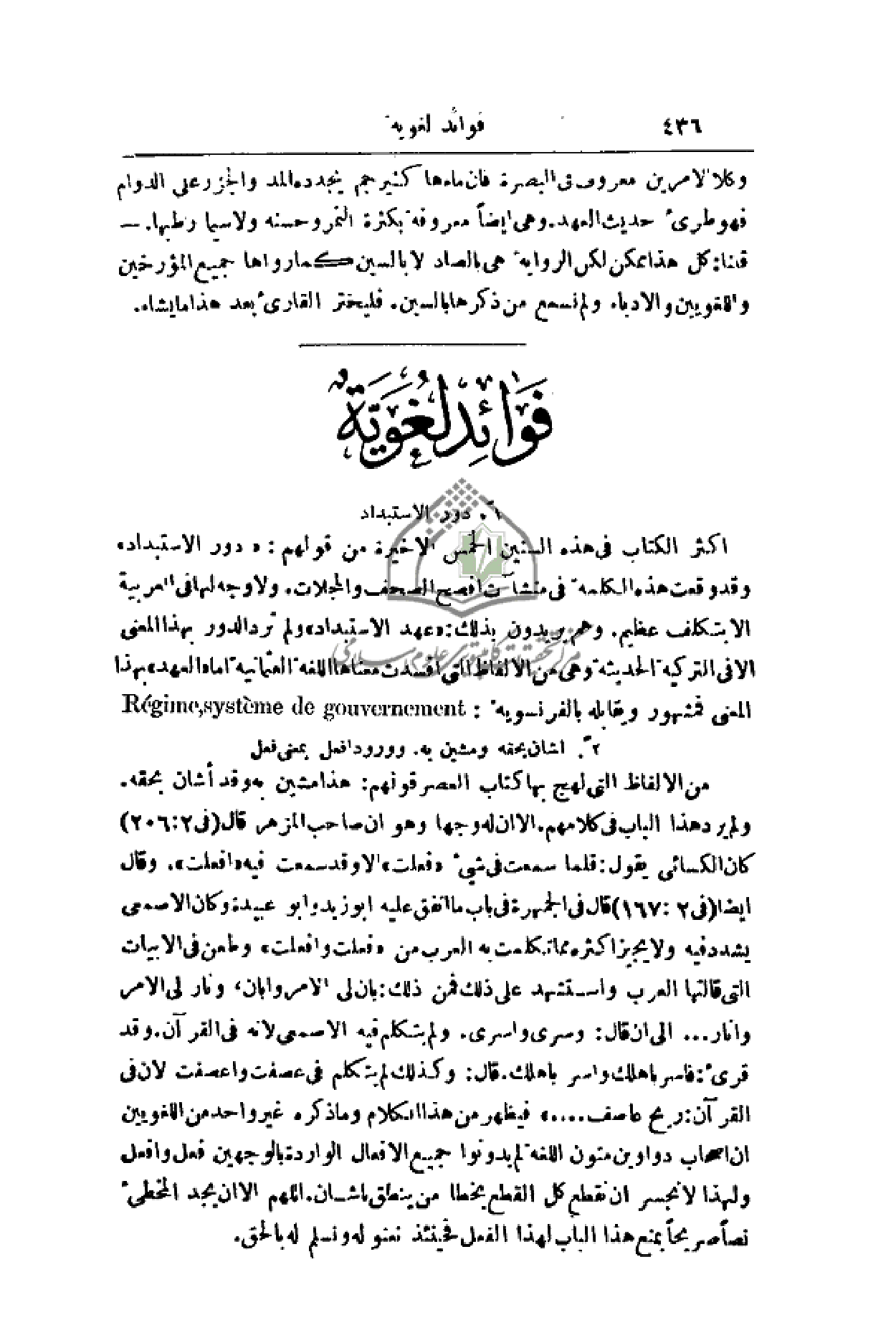 أكثر الكتاب في هذه السنين الخمس الأخيرة من قولهم: (دور الاستبداد) وقد وقعت هذه الكلمة في منشآت أفصح الصحف والمجلات. ولا وجه لها في العربية إلا بتكلف عظيم. وهم يريدون بذلك: (عهد الاستبداد) ولم ترد الدور المعنى إلا في التركية الحديثة وهي من الألفاظ التي أفسدت معناها اللغة العثمانية أما (العهد) بهذا المعنى فمشهور ويقابله بالفرنسوية: