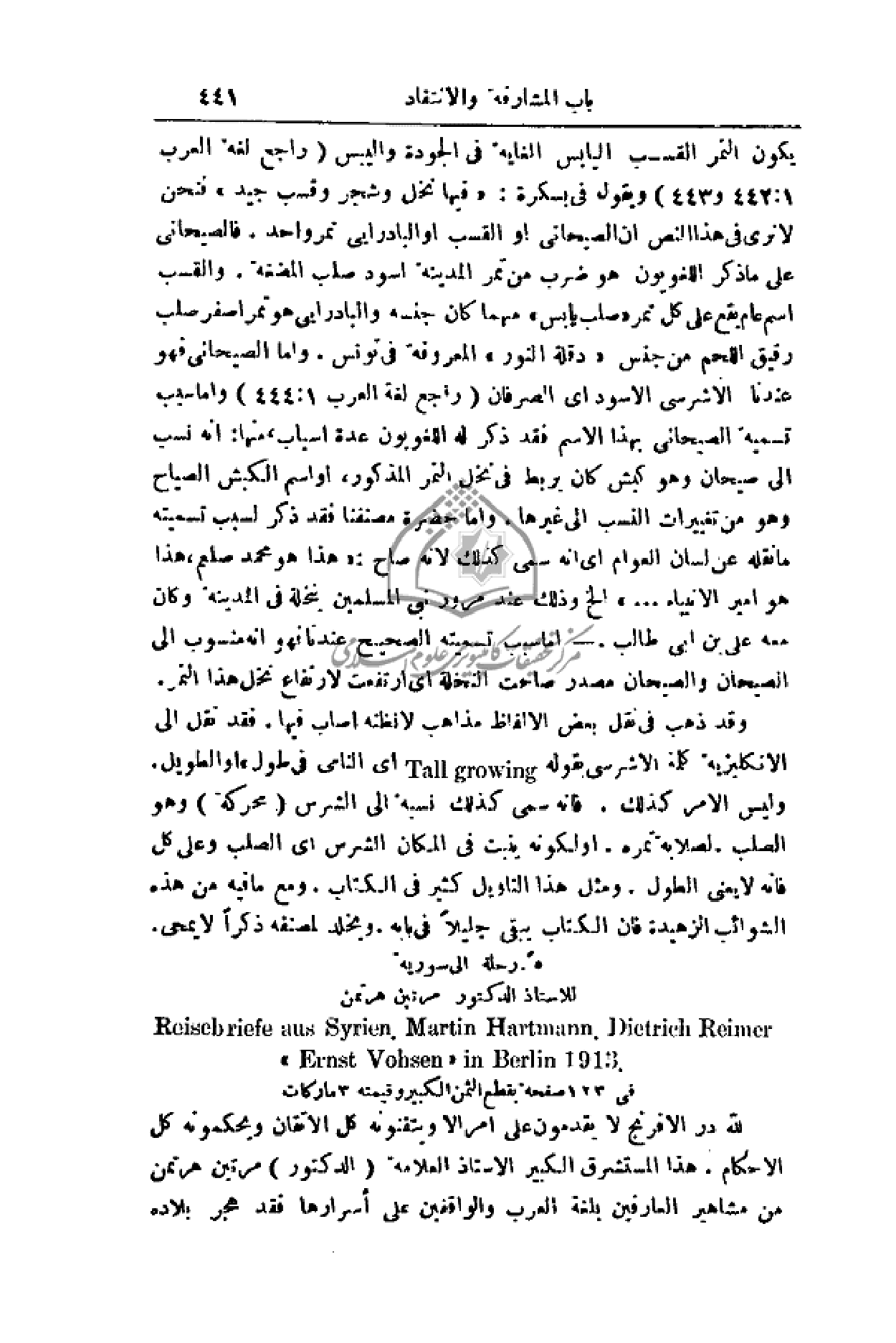 (دقلة النور) المعروفة في تونس. وأما الصيحاني فهو عندنا الاشرسي الأسود أي الصرفان (راجع لغة العرب 1: 444) وأما سبب تسمية الصيحاني بهذا الاسم فقد ذكر له اللغويون عدة أسباب، منها: إنه نسب إلى صيحان وهو كبش كان يربط في نخل التمر المذكور، أو اسم الكبش الصياح وهو من تغييرات النسب إلى غيرها. وأما حضرة مصنفنا فقد ذكر لسبب تسميته ما نقله عن لسان العوام أي أنه سمى كذلك لأنه صاح: (هذا هو محمد - صلى الله عليه وسلم -، هذا هو أمير الأنبياء. . .) الخ وذلك عند مرور نبي المسلمين بنخلة في المدينة وكان معه علي بن أبي طالب. - أما سبب تسميته الصحيح عندنا فهو أنه منسوب إلى الصيحان والصيحان مصدر صاحت النخلة أي ارتفعت لارتفاع نخل هذا التمر.