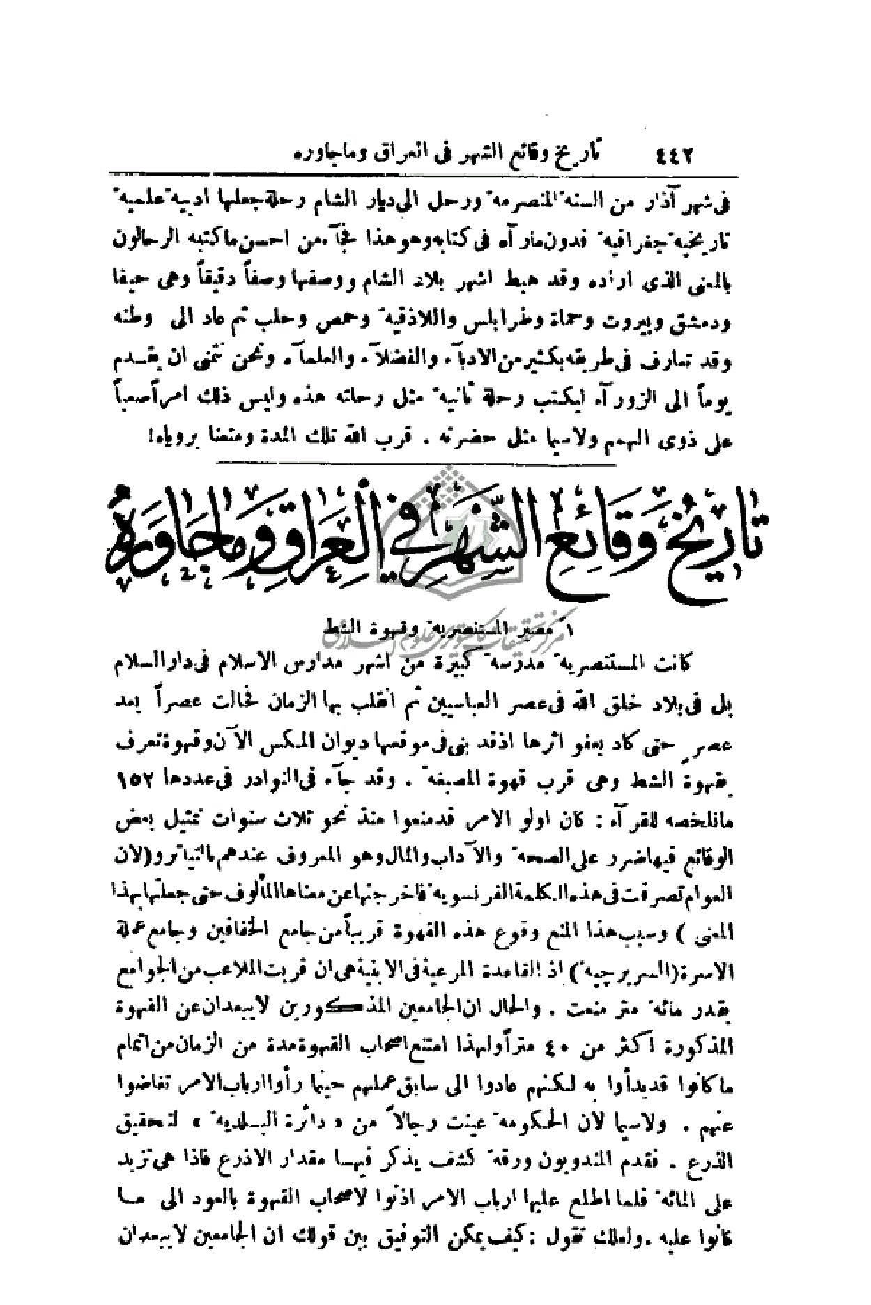 كانت المستنصرية مدرسة كبيرة من أشهر مدارس الإسلام في دار السلام بل في بلاد خلق الله في عصر العباسيين ثم انقلب بها الزمان فحالت عصراً بعد عصرٍ حتى كاد يعفو أثرها إذ قد بني في موقعها ديوان المكس الآن وقهوة تعرف بقهوة الشط وهي قرب قهوة المصبغة. وقد جاء في النوادر في عددها 152 ما نلخصه للقراء: كان أولو الأمر قد منعوا منذ نحو ثلاث سنوات فمثيل بعض الوقائع فيها ضرر على الصحة والآداب والمال وهو المعروف عندهم بالتياترو (لأن العوام تصرفت في هذه الكلمة الفرنسوية فأخرجتها عن معناها المألوف حتى جعلتها بهذا المعنى) وسبب هذا المنع وقوع هذه القهوة قريباً من جامع الخفافين وجامع عملة الأسرة (السريرجية) إذ القاعدة المرعية في الأبنية هي إن قربت الملاعب من الجوامع بقدر مائة متر منعت. والحال أن الجامعين المذكورين لا يبعدان عن القهوة المذكورة أكثر من 40 متراً ولهذا امتنع أصحاب القهوة مدة من الزمان من إتمام ما كانوا قد بدءوا به لكنهم عادوا إلى سابق عملهم حينما رأوا أرباب الأمر تغاضوا عنهم. ولا سيما لأن الحكومة عينت رجالاً من (دائرة البلدية) لتحقيق الذرع. فقدم المندوبون ورقة كشف يذكر فيها مقدار الأذرع فإذا هي تزيد على المائة فلما أطلع عليها أرباب الأمر أذنوا لأصحاب القهوة بالعود إلى ما كانوا عليه. ولعلك تقول: كيف يمكن التوفيق بين قولك إن الجامعين لا يبعدان