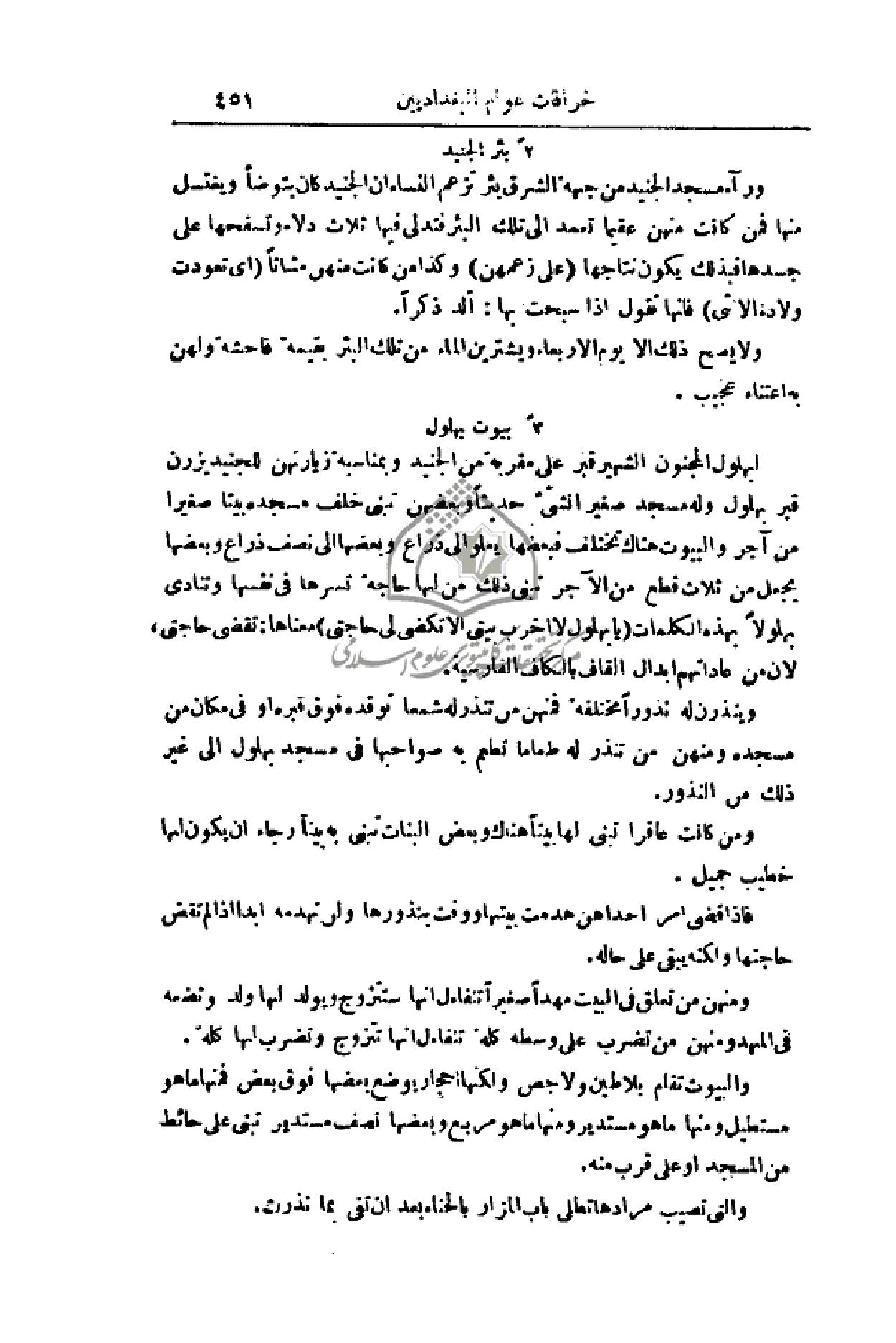 وراء مسجد الجنيد من جهة الشرق بئر يزعم النساء أن الجنيد كان يتوضأ ويغتسل منها فمن كانت منهن عقيماً تعمد إلى تلك البئر فتدلي فيها ثلاث دلاء وتسفحها على جسدها فبذلك يكون نتاجها (على زعمهن) وكذا من كانت منهن مثاثاً (أي تعودت ولادة الأنثى)