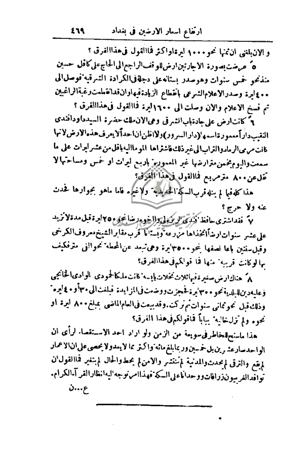 7 - فقد اشترى حافظ أفندي الريزه لي وأخوه رضا بنحو 250 ليرة قبل مدة لا تزيد على عشرة سنوات أرضاً اتخذاها مزرعة وبستاناً قرب مقابر الشيخ معروف الكرخي وقبل سنتين باعا نصفها بنحو 3500 ليرة وهي تبعد عن المحطة نحو ألفي متر فكيف بها لو كانت قريبة منها فما قولكم في هذا الفرق؟