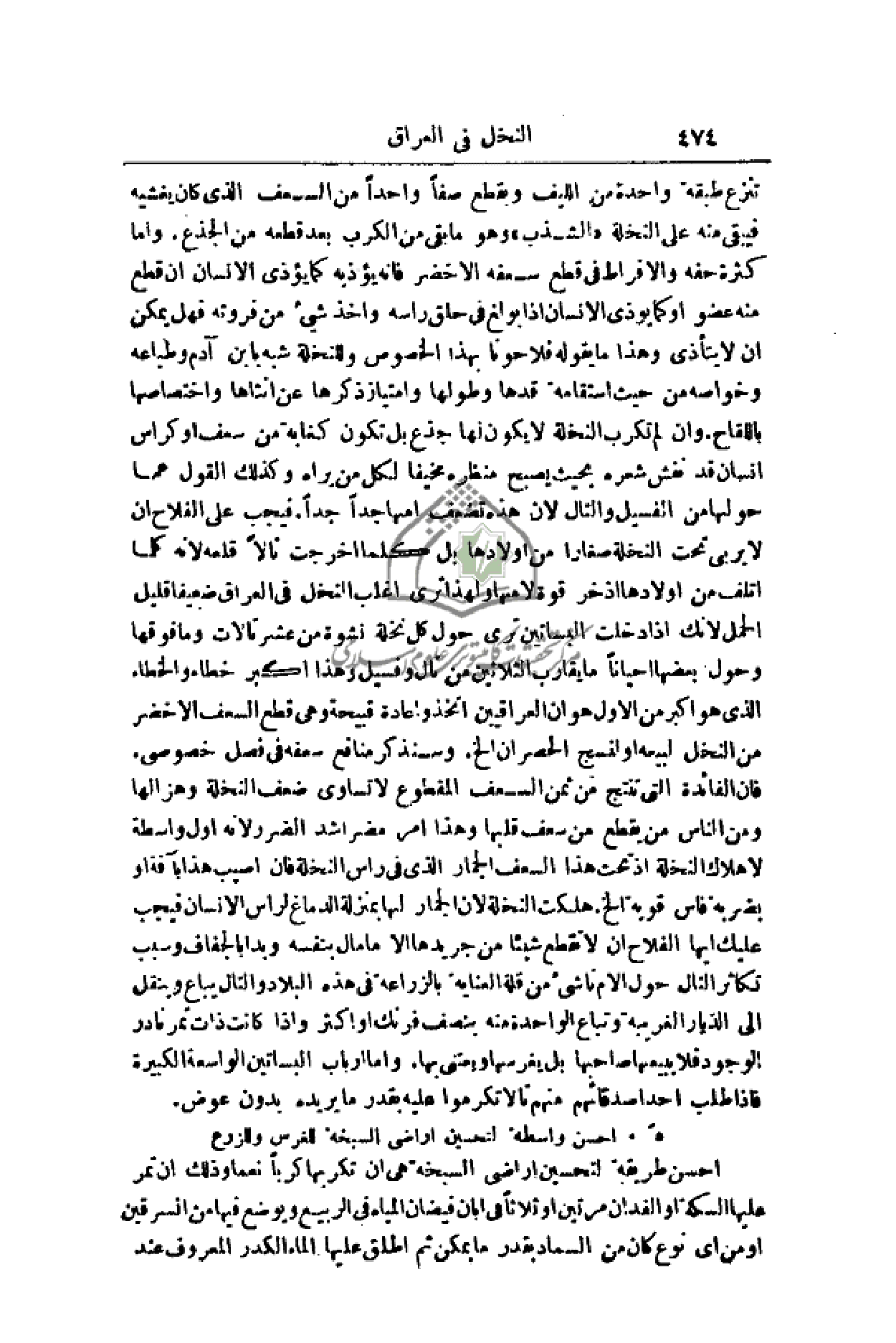 وطباعه وخواصه من حيث استقامة قدها وطولها وامتياز ذكرها عن إناثها واختصاصها باللقاح. وإن لم تكرب النخلة لا يكون لها جذع بل تكون كغابة من سعف أو كرأس إنسان قد نفش شعره بحيث يصبح منظره مخيفاً لكل من يراه وكذلك القول عما حولها من الفسيل والتال لأن هذه تضعف أمها جداً جداً. فيجب على الفلاح أن لا يربي تحت النخلة صغاراً من أولادها بل كلما خرجت تالاً قلعه لأنه كلما اتلف من أولادها أذخر قوة لأمها ولهذا ترى اغلب النخل في العراق ضعيفاً قليل الحمل لأنك إذا دخلت البساتين ترى حول كل نخلة نشوة من عشر تالات وما فوقها وحول بعضها أحيانا ما يقارب الثلاثين من تال وفسيل وهذا أكبر خطاء والخطاء الذي هو أكبر من الأول هو أن العراقيين اتخذوا عادة قبيحة وهي قطع السعف الأخضر من النخل لبيعه أو لنسج الحصران الخ. وسنذكر منافع سعفه في فصل خصوصي. فإن الفائدة التي تنتج من ثمن السعف المقطوع لا تساوي ضعف النخلة وهزالها ومن الناس من يقطع من سعف قلبها وهذا أمر مضر أشد الضرر لأنه أول واسطة لأهلاك النخلة إذ تحت هذا السعف الجمار الذي في رأس النخلة فإن أصيب هذا بآفة أو بضربة فاس قوية الخ. هلكت النخلة لأن الجمار لها بمنزلة الدماغ لرأس الإنسان فيجب عليك أيها الفلاح أن لا تقطع شيئاً من جريدها إلا ما مال بنفسه وبدا بالجفاف وسبب تكاثر التال حول الأم ناشئ من قلة العناية بالزراعة في هذه البلاد والتال يباع وينقل إلى الديار الغريبة وتباع الواحدة منه بنصف فرنك أو أكثر وإذا كانت ذات تمر نادر الوجود فلا يبيعها صاحبها بل يغرسها ويعتني بها. وأما أرباب البساتين الواسعة الكبيرة فإذا طلب أحد أصدقائهم منهم تالاً تكرموا عليه بقدر ما يريده بدون عوض.