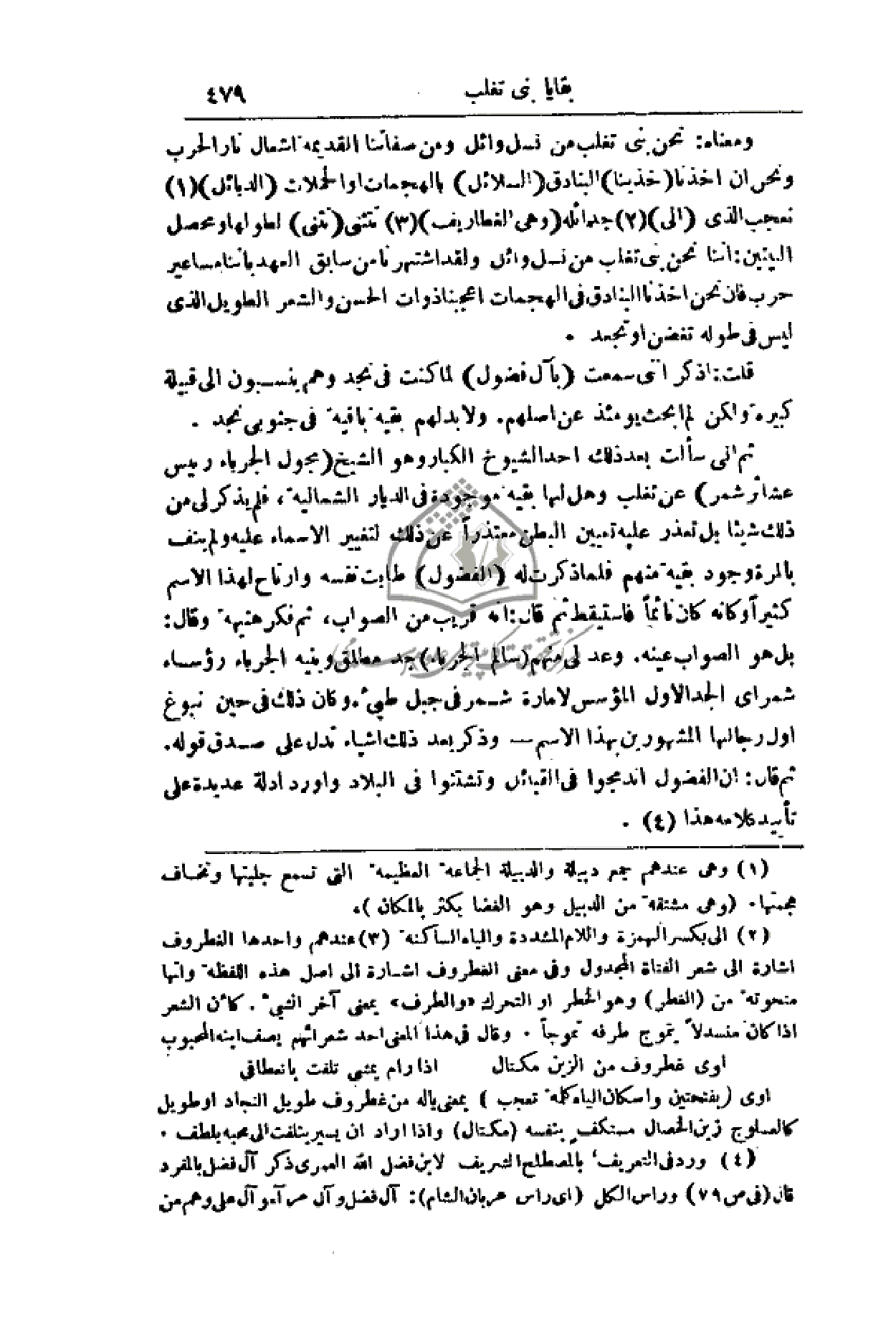 ثم إني سألت بعد ذلك أحد الشيوخ الكبار وهو الشيخ (مجول الجرباء رئيس عشائر شمر) عن تغلب وهل لها بقية موجودة في الديار الشمالية، فلم يذكر لي من ذلك شيئاً بل تعذر عليه تعيين البطن معتذراً عن ذلك لتغيير الأسماء عليه ولم ينف بالمرة وجود بقية منهم فلما ذكرت له (الفضول) طابت نفسه وأرتاح لهذا الاسم كثيراً وكأنه كان نائماً فاستيقظ ثم قال: إنه قريب من الصواب، ثم فكر هنيئة وقال: بل هو الصواب عينه. وعد لي منهم (سالم الجرباء) جد مطلق وبنيه الجرباء رؤساء شمر أي الجد الأول المؤسس لإمارة شمر في جبل طي. وكان ذلك في حين نبوغ أول رجالها المشهورين بهذا الاسم - وذكر بعد ذلك أشياء تدل على صدق قوله. ثم قال: إن الفضول اندمجوا في القبائل وتشتتوا في البلاد وأورد أدلة عديدة على تأييد كلامه هذا.