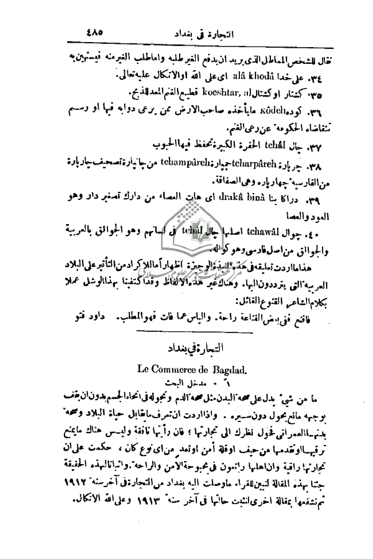 ما من شيء يدل على صحة البدن مثل صحة الدم وتجوله في أنحاء الجسم بدون أن يقف بوجهه مانع يحول دون سيره. وإذا أردت أن تعرف ما يقابل حياة البلاد وصحة بدنها العمراني فحول نظرك إلى تجارتها؛ فإن رأيتها نافقة وليس هناك ما يمنع ترقيها أو تقدمها من حيف أو قلة أمن أو تعدٍ من أي نوع كان، حكمت على أن تجارتها راقية وإن أهلها راتعون في بحبوحة الأمن والراحة. وإثباتاً لهذه الحقيقة جئنا بهذه المقالة لنبين للقراء ما وصلت إليه بغداد من التجارة في آخر سنة 1912 ثم نشفعها بمقالة أخرى لنثبت حالتها في آخر سنة 1913 وعلى الله الاتكال.