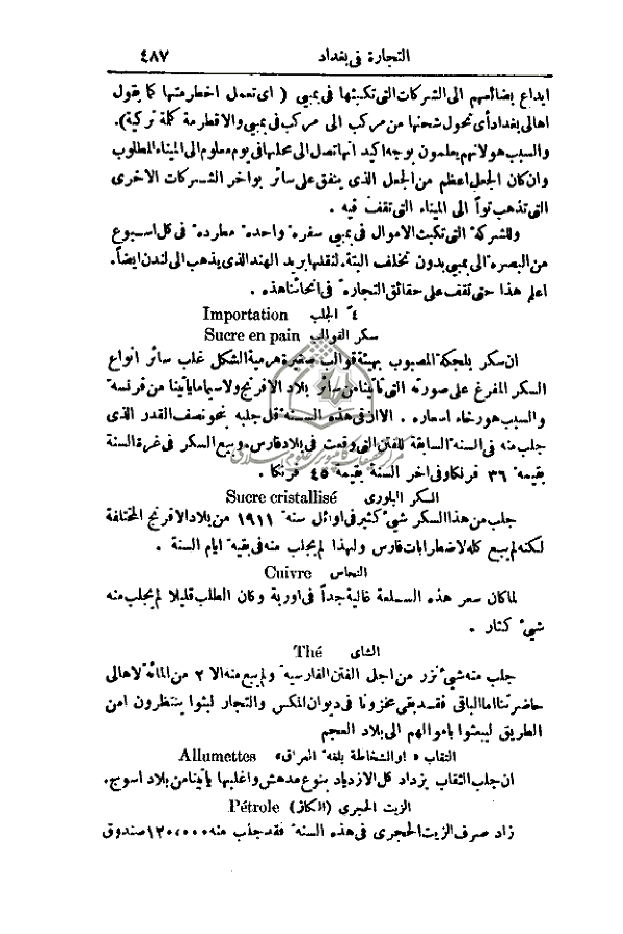 جلب من هذا السكر شيء كثير في أوائل سنة 1911 من بلاد الإفرنج المختلفة لكنه لم يبع كله لاضطرابات فارس ولهذا لم يجلب منه في بقية أيام السنة.