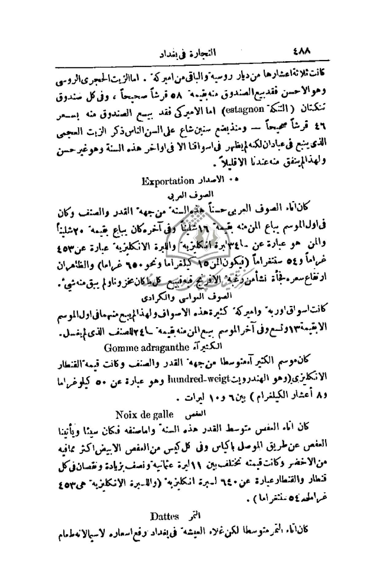 كان اتاء العفص متوسط القدر هذه السنة وأما صنفه فكان سيئاً ويأتينا العفص عن طريق الموصل بأكياس وفي كل كيس من العفص الأبيض أكثر مما فيه من الأخضر وكانت قيمته تختلف بين 11 ليرة عثمانية ونصف بزيادة ونقصان في كل قنطار والقنطار عبارة عن 640 ليرة إنكليزية (والليرة الإنكليزية هي 453 غراما و54 سنتغراما).