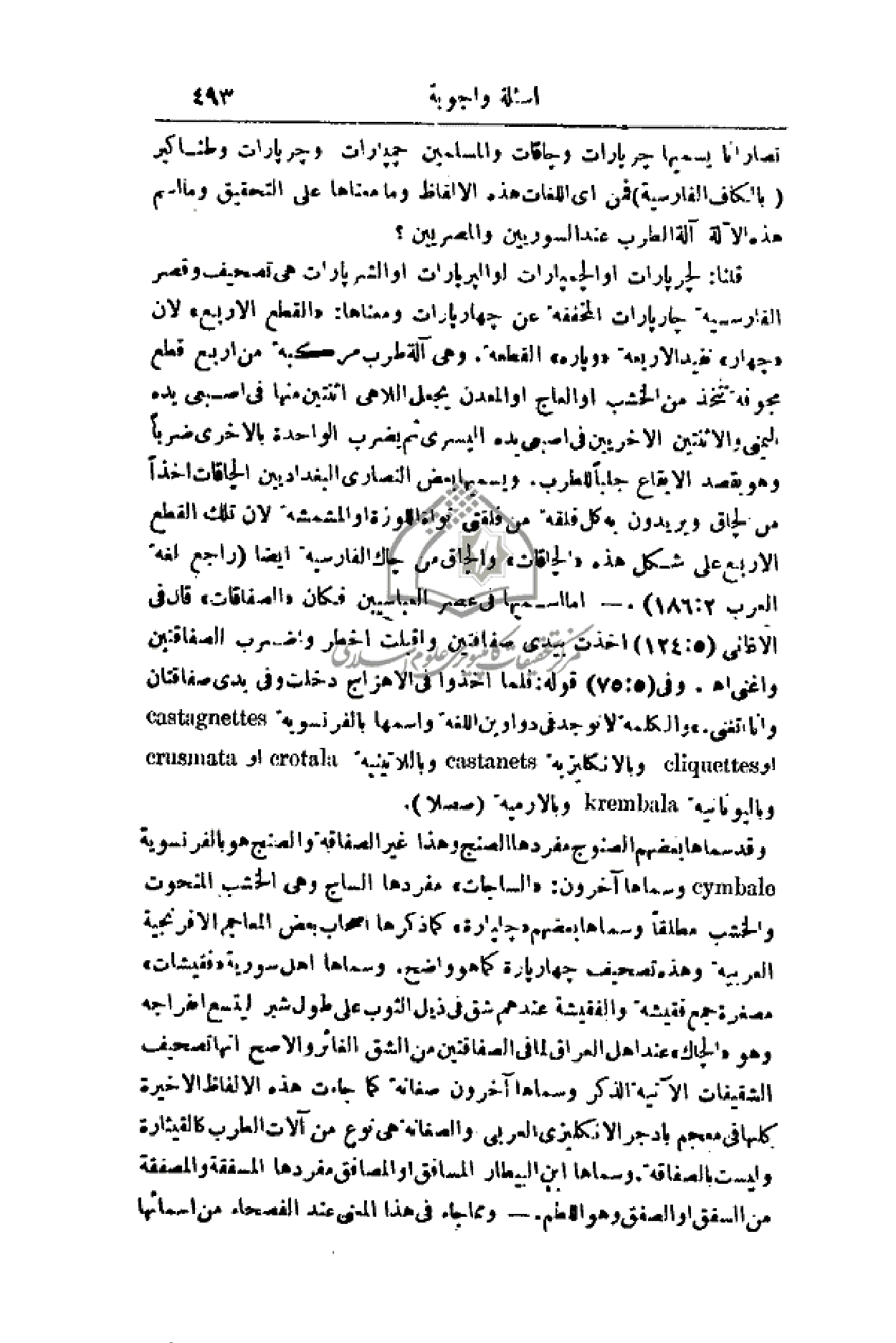 قلنا: لجربارات أو الجمبارات أو البربارات أو الشربارات هي تصحيف وقصر الفارسية جاربارات المخففة عن جهاربارات ومعناها: (القطع الأربع) لأن (جهار) تفيد الأربعة (وباره) القطعة. وهي آلة طرب مركبة من أربع قطع مجوفة تتخذ من الخشب أو العاج أو المعدن يجعل اللاهي اثنتين منها في إصبعي يده اليمنى والاثنتين الأخريين في إصبعي يده اليسرى ثم يضرب الواحدة بالأخرى ضرباً وهو يقصد الإيقاع جلباً للطرب. ويسميها بعض النصارى البغداديين الجاقات أخذا من الجاق ويريدون به كل فلقة من فلقتي نواة اللوزة أو المشمشة لأن تلك القطع الأربع على شكل هذه (الجاقات) والجاق من جاك الفارسية أيضاً (راجع لغة العرب 2: 186). - أما اسمها في عصر العباسيين فكان (الصفاقات) قال في الأغاني 5: 124) أخذت بيدي صفافتين وأقبلت اخطر واضرب الصفاقتين وأغني أهـ. وفي (5: 75) قوله: فلما اخذوا في الأهزاج دخلت وفي يدي صفاقتان وأنا أتغنى.) والكلمة لا توجد في دواوين اللغة واسمها بالفرنسوية أو وبالإنكليزية وباللاتينية أو وباليونانية وبالأرمية (صصلا).