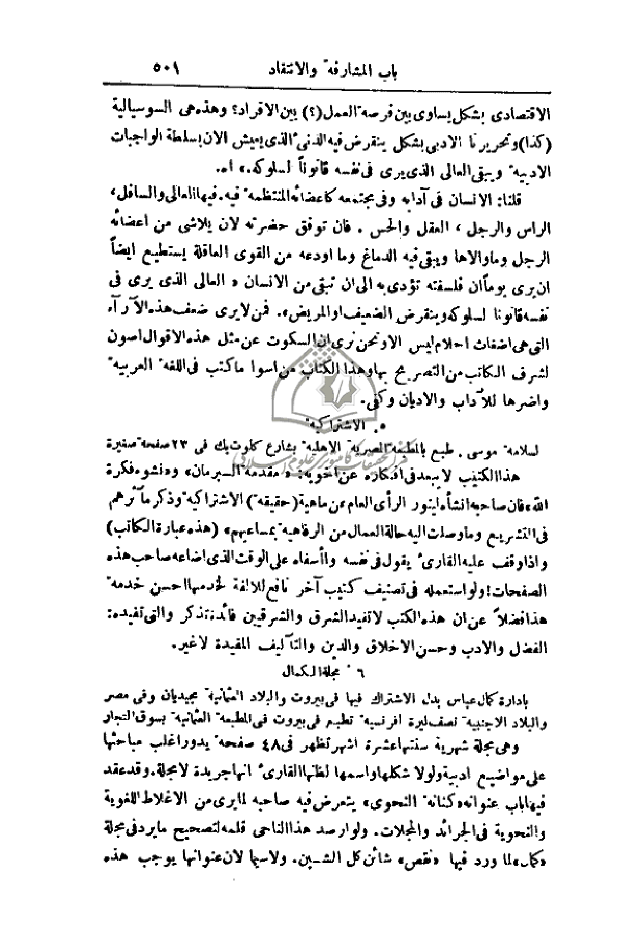 هذا الكتيب لا يبعد في أفكاره عن أخويه: (مقدمة السبرمان) و (نشوء فكرة الله) فإن صاحبه أنشأه لينور الرأي العام عن ماهية (حقيقة) الاشتراكية وذكر مآثرهم في التشريع وما وصلت إليه حالة العمال من الرفاهية بمساعديهم) (هذه عبارة الكاتب) وإذا وقف عليه القارئ يقول في نفسه وا أسفاه على الوقت الذي أضاعه صاحب هذه الصفحات! ولو استعمله في تصنيف كتيب آخر نافع للألفة لخدمها احسن خدمة هذا فضلاً عن أن هذه الكتب لا تفيد الشرق والشرقيين فائدة تذكر والتي تفيده: الفضل والأدب وحسن الأخلاق والدين والتآليف المفيدة لا غير.