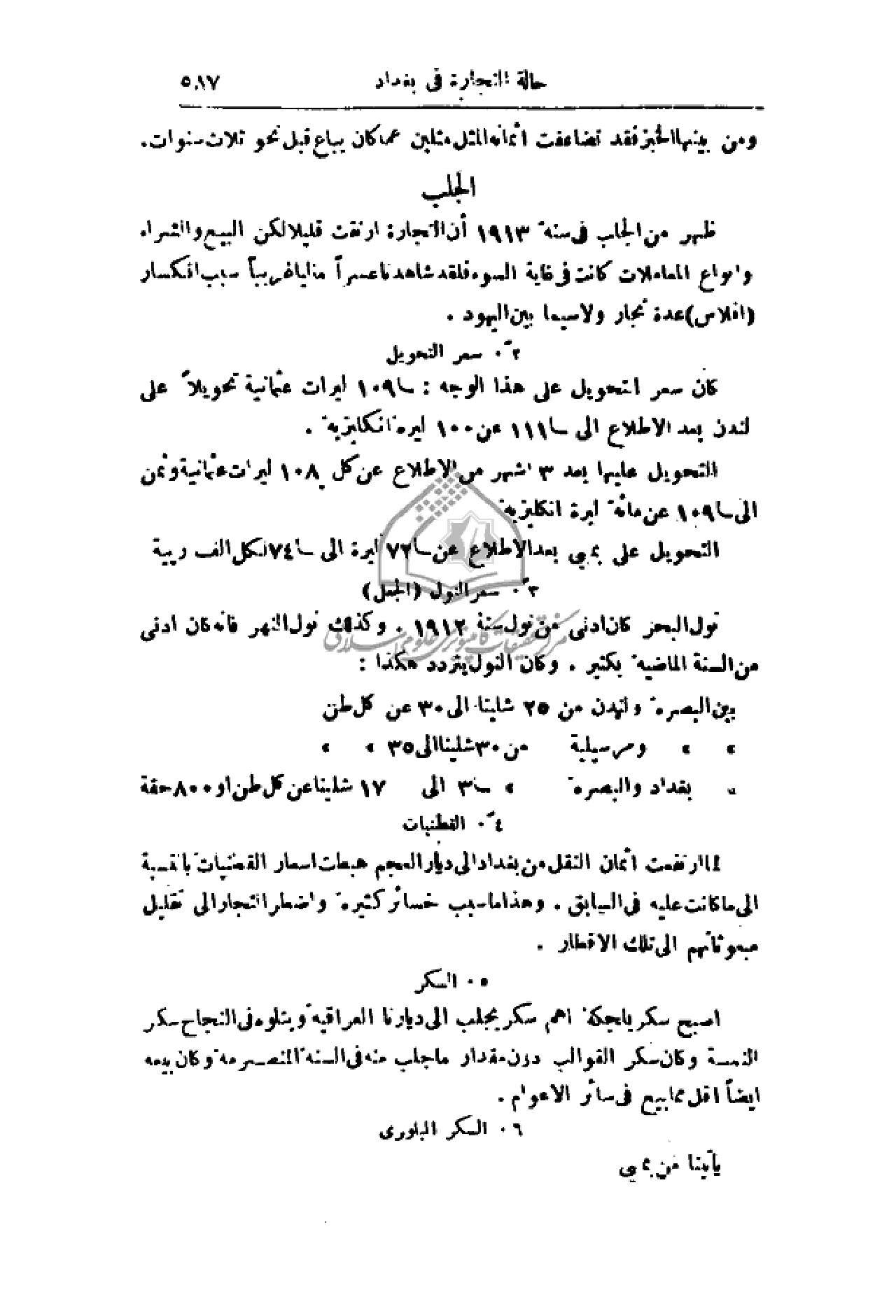 اصبح السكر بلجكة أهم سكر يجلب إلى ديارنا العراقية ويتلوه في النجاح سكر النمسة وكان سكر القوالب دون مقدار ما جلب منه في السنة المنصرمة وكان بيعه أيضاً اقل مما بيع في سائر الأعوام.