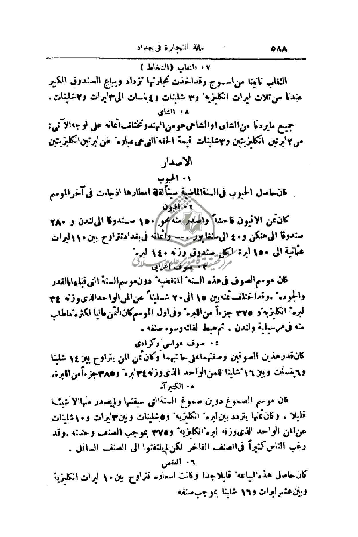 كان ثمن الأفيون فاحشاً واصدر منه نحو 150 صندوقاً إلى لندن و280 صندوقا إلى هنكن و 40 إلى سنغابور. - وأثمانه في بغداد تتراوح بين 110 ليرات عثمانية إلى 150 ليرة لكل صندوق وزنه 140 ليرة