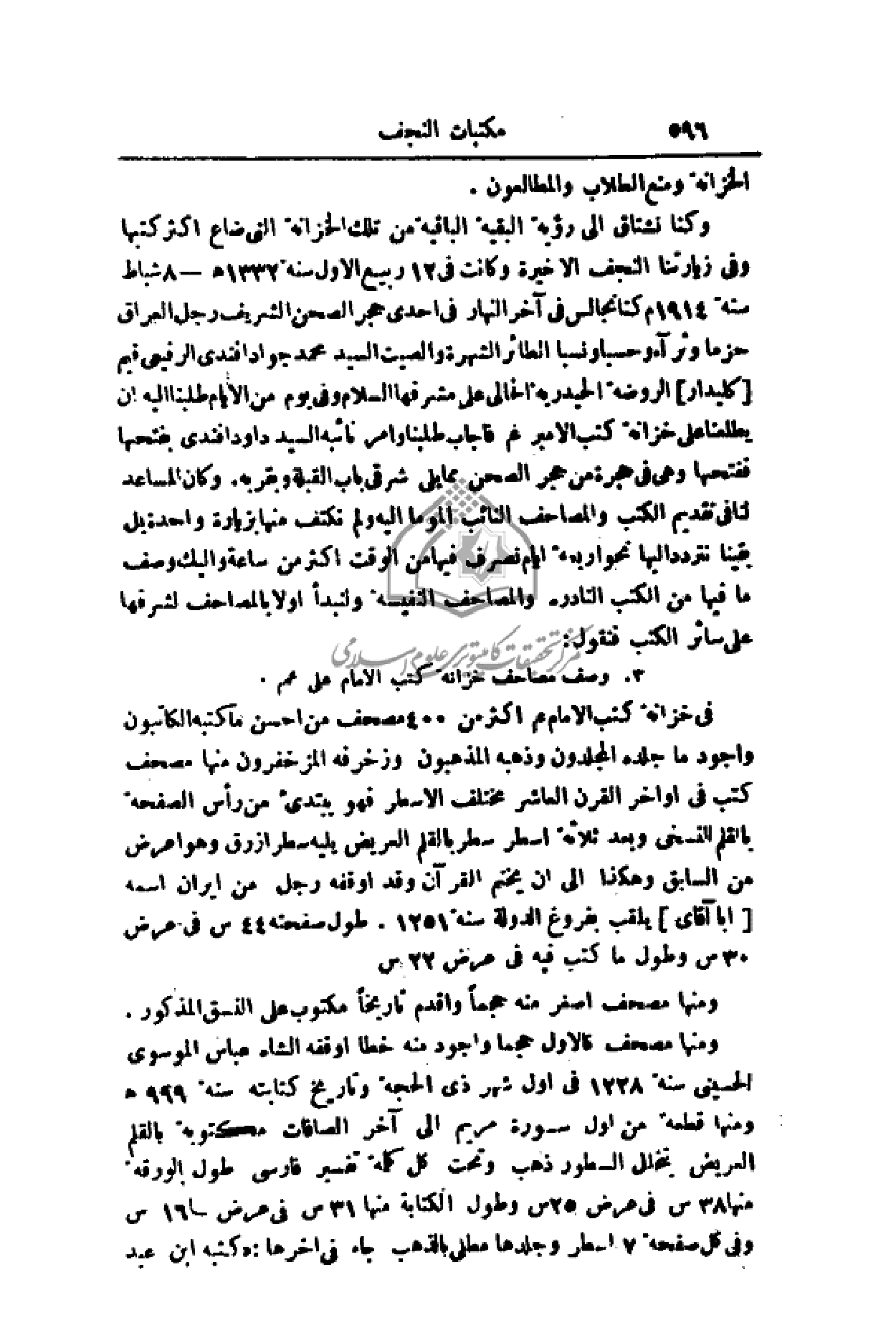 وكنا نشتاق إلى رؤية البقية الباقية من تلك الخزانة التي ضاع اكثر كتبها وفي زيارتنا النجف الأخيرة وكانت في 12 ربيع الأول سنة 1332هـ - 8 شباط سنة 1914م كنا نجالس في آخر النهار في إحدى حجر الصحن الشريف رجل العراق حزما وثراء وحسبا ونسبا الطائر الشهرة والصيت السيد محمد جواد أفندي الرفيعي قيم (كليدار) الروضة الحيدرية الحالي على مشرفها السلام وفي يوم من الأيام طلبنا إليه أن يطلعنا على خزانة كتب الأمير عم فأجاب طلبنا وأمر نائبه السيد داود أفندي بفتحها ففتحها وهي حجرة من حجر الصحن مما يلي شرقي القبلة وبقربه. وكان المساعد لنا في تقديم الكتب والمصاحف النائب الموما إليه ولم نكتف منها بزيارة واحدة بل بقينا نتردد إليها نحو أربعة أيام نصرف فيها من الوقت اكثر من ساعة واليك وصف ما فيها من الكتب النادرة والمصاحف النفيسة ولنبدأ أولا بالمصاحف لشرفها على سائر الكتب فنقول: