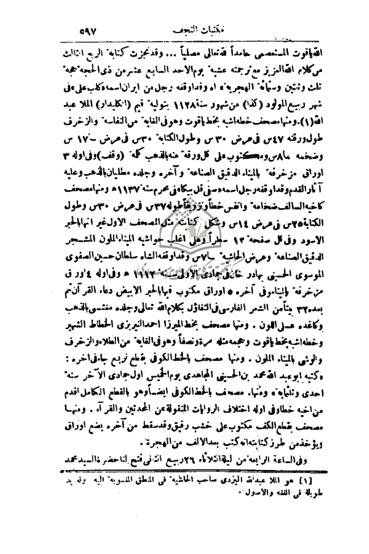 وقد أوقفه رجل من إيران اسمه (كلب علي) في شهر ربيع المولود (كذا) من شهور سنة 1128 بتولية قيم (الكليدار) الملا عبد الله ومنها مصحف خطه أشبه بخط ياقوت وهو في الغاية من النفاسة والزخرف طول ورقته 47 س في عرض 30 س وطول الكتابة 30 س في عرض 17 س وضخمه 8 س ومكتوب على كل ورقة منه بالذهب كلمة (وقف) وفي أوله 3 أوراق مزخرفة بالميناء الدقيق الصناعة وآخره وجلده مطليان بالذهب وعليه آثار القدم وقد أوقفه رجل اسمه (صفي قل بيكا) في محرم سنة 1137هـ ومنها مصحف كأخيه السالف ضخامة وانفس خطاً وتزويقاً طوله 37 س في عرض 30 س وطول الكتابة 25 س في عرض 14 س وشكل كتابته مثل المصحف الأول غير أنها بالحبر الأسود وفي كل صفحة 12 سطراً وعلى اغلب حواشيه الميناء الملون المشجر الدقيق الصناعة وعرض الحاشية 7 س وقد أوقفه الشاه سلطان حسين الصفوي الموسوي الحسيني بهادر خان في جمادى الأول سنة 1112 هـ وفي أوله 4 أوراق مزخرفة بالميناء وفي آخره 5 أوراق مكتوب فيها بالحبر الأبيض دعاء القرآن ثم بعده 32 بيتاً من الشعر الفارسي في التفاؤل بكلام الله تعالى وجلده مغشي بالذهب وكاغده عسلي اللون. ومنها مصحف بخط الميرزا احمد النيربزي الخطاط الشهير وخطه أشبه بخط ياقوت وحجمه مثله مرة ونصفاً وهو في الغاية من الطلاء والزخرف والوشي بالميناء الملون. ومنها مصحف بالخط الكوفي بقطع الربع جاء في آخره: (كتبه أبو عبد الله محمد بن الحسيني المجاهدي يوم الخميس أول جمادى الآخر سنة إحدى وثلثماية) ومنها مصحف بالخط الكوفي أيضاً وهو بالقطع الكامل اقدم من أخيه خطا وفي أوله اختلاف الروايات المنقولة عن المحدثين والقراء. ومنها مصحف بقطع الكف مكتوب على خشب رقيق وقد سقط من آخره بضع أوراق ويؤخذ من طراز كتابته أنه كتب بعد الألف من الهجرة.