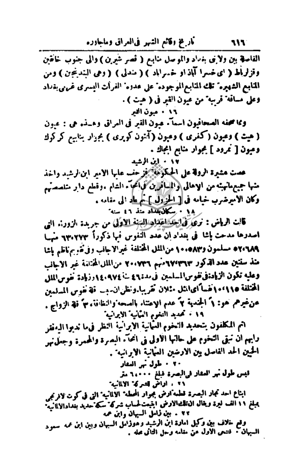 قالت الرياض: نرى في أحد أعداد السنة الأولى من جريدة الزوراء التي أصدرها مدحت باشا في بغداد أن عدد النفوس فيها ذكوراً 63. 273 منها 52. 689 مسلمون و10. 583 من الملل المختلفة غير الأجانب وفي تقويم ناظم باشا منذ سنتين عدد الذكور 67. 363 منهم 20. 736 من الملل المختلفة غير الأجانب وعليه تكون الزيادة في نفوس المسلمين في مدة 46 سنة 14. 974 وزيادة نفوس الملل المختلفة 10. 115 نفساً أي المثل مثلان تقريبا. ونظن أن سبب قلة نفوس المسلمين عن غيرهم هو: 1: الجندية، 2: عدم الاعتناء بالصحة والنظافة، 3: قلة الزواج.