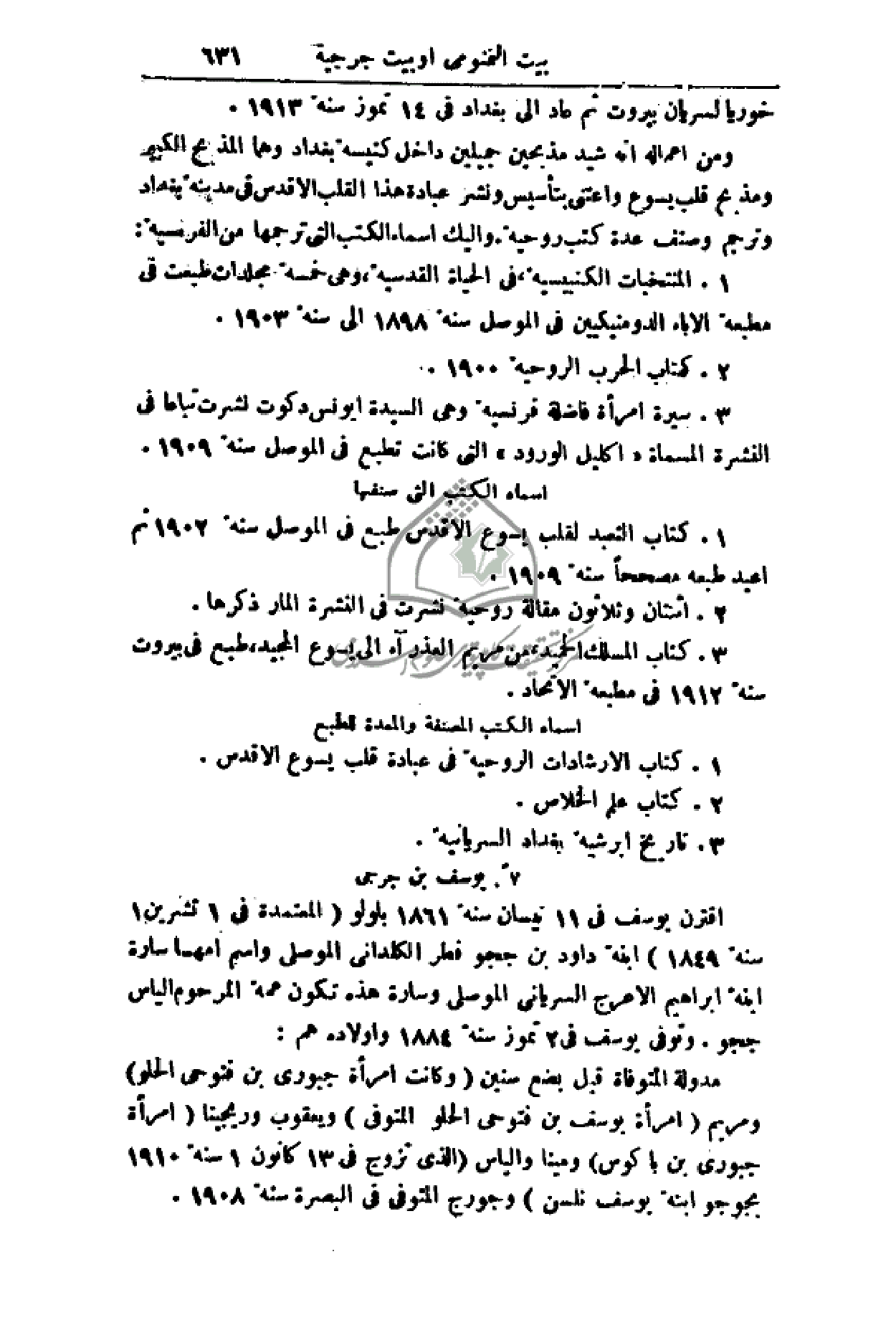 1 - كتاب التعبد لقلب يسوع الأقدس طبع في الوصل سنة 1902 ثم أعيد طبعه مصححاً سنة 1909.