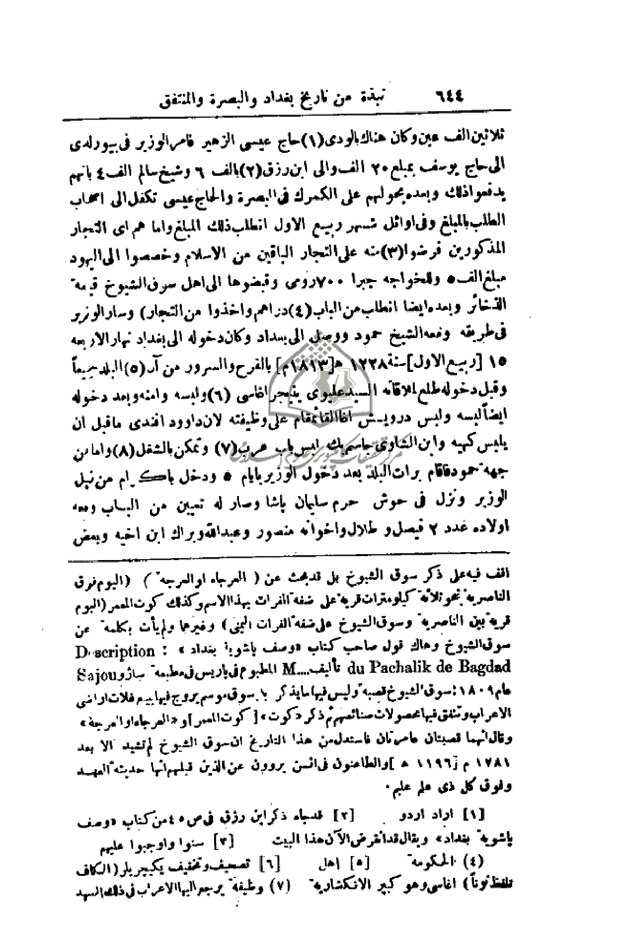 ثلاثين ألف عين وكان هناك بالودي حاج عيسى الزهير فأمر الوزير في بيورلدى إلى الحاج يوسف بمبلغ 20 ألف وإلى ابن رزق بألف 6 وشيخ سالم ألف 4 بأنهم يدفعوا ذلك وبعده يحولهم على الكمرك في البصرة والحاج عيسى تكفل إلى أصحاب الطلب بالمبلغ وفي أوائل شهر ربيع الأول أنطلب ذلك المبلغ وأما هم أي التجار المذكورين فرضوا منه على التجار الباقين من الإسلام وخصصوا إلى اليهود مبلغ ألف 5 وللخواجة جبرا 700 رومي وقبضوها إلى أهل سوق الشيوخ قيمة الذخائر وبعده أيضاً انطلب من الباب دراهم واخذوا من التجار) وسار الوزير في طريقه ومعه الشيخ حمود ووصل إلى بغداد وكان دخوله إلى بغداد نهار الربعه 15 (ربيع الأول) سنة 1228هـ (1813م) بالفرح والسرور من آل البلد جميعاً وقبل دخوله طلع لملاقاته السيد عليوي ينيجر اغاسي ولبسه وأمنه وبعد دخوله أيضاً لبسه ولبس درويش اغا القائمقام على وظيفته لأن داود أفندي ما قبل أن يلبس كهيه وابن الشاوي جاسم بك لبس باب عرب وتمكن بالشغل وأما من جهة حمود فأقام برات البلد بعد دخول الوزير بأيام 5 ودخل بإكرام من قبل الوزير ونزل في حوش سليمان باشا وصار له تعيين من الباب ومعه أولاده عدد 2 فيصل وطلال وإخوانه منصور وعبد الله وبراك ابن أخيه وبعض