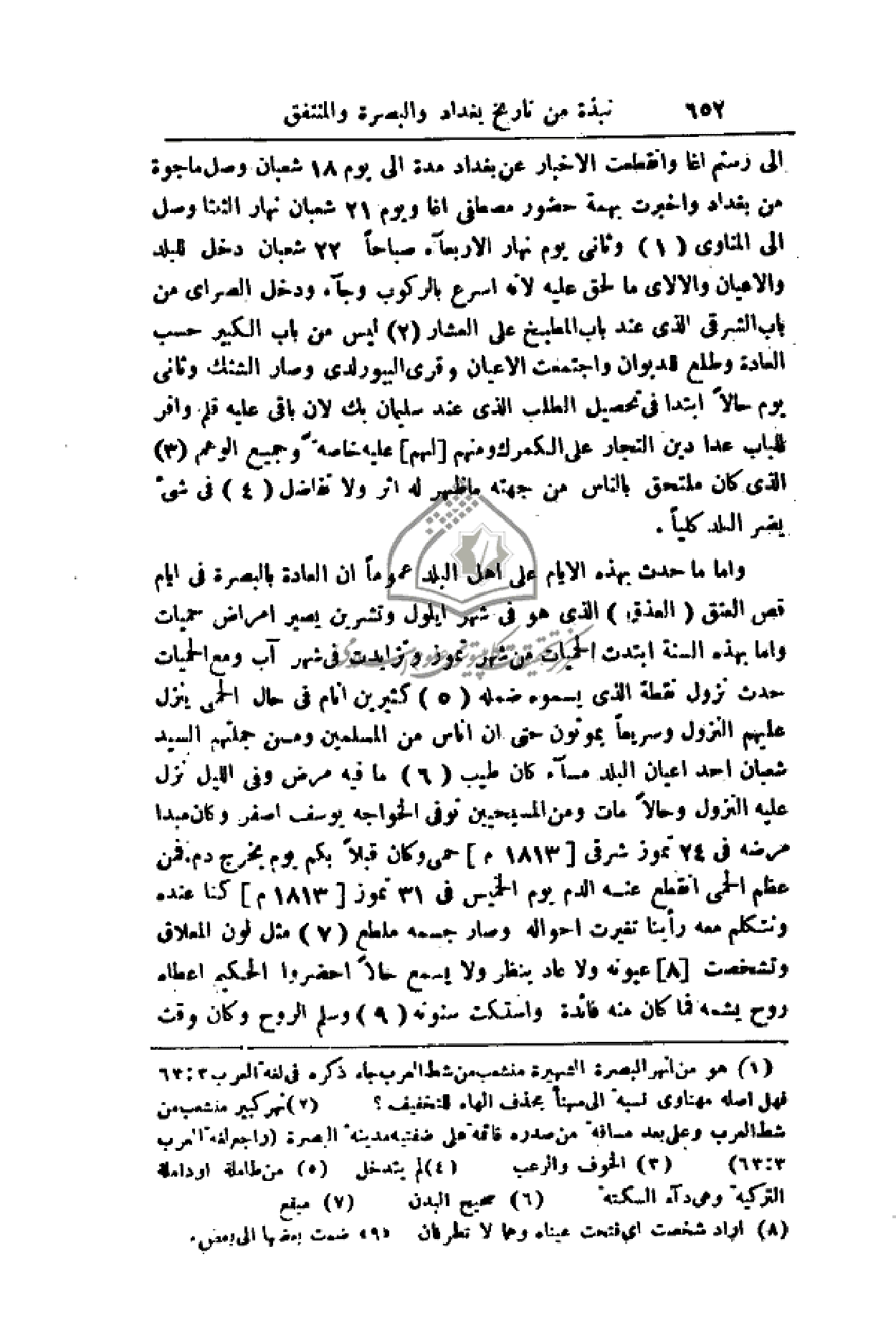 وأما ما حدث بهذه اليام على أهل البلد عموماً أن العادة بالبصرة في أيام قص العتق (العذق) الذي هو في شهر أيلول وتشرين يصير أمراض حميات وأما بهذه السنة أبتدت الحميات من شهر تموز وتزايدت في شهر آب ومع الحميات حدث نزول نقطة الذي يسموه ضمله كثيرين أنام في حال الحمى ينزل عليهم النزول وسريعاً يموتون حتى أن أناس من المسلمين ومن جملتهم السيد شعبان أحد أعيان البلد مساء كان طيب ما فيه مرض وفي الليل نزل عليه النزول وحالاً مات ومن المسيحيين توفى الخواجه يوسف أصفر وكان مبدأ مرضه في 24 تموز شرقي (1813م) حمى وكان قبلاً بكم يوم يخرج دم. فمن عظم الحمى انقطع عنه الدم يوم الخميس في 31 تموز (1813م) كنا عنده ونتكلم معه رأينا تغيرت أحواله وصار جسمه ملطع مثل لون المعلاق وتشخصت عيونه ولا عاد ينظر ولا يسمع حالاً احضروا الحكيم أعطاه روح يشمه فما كان منه فائدة واستكت سنونه وسلم الروح وكان وقت