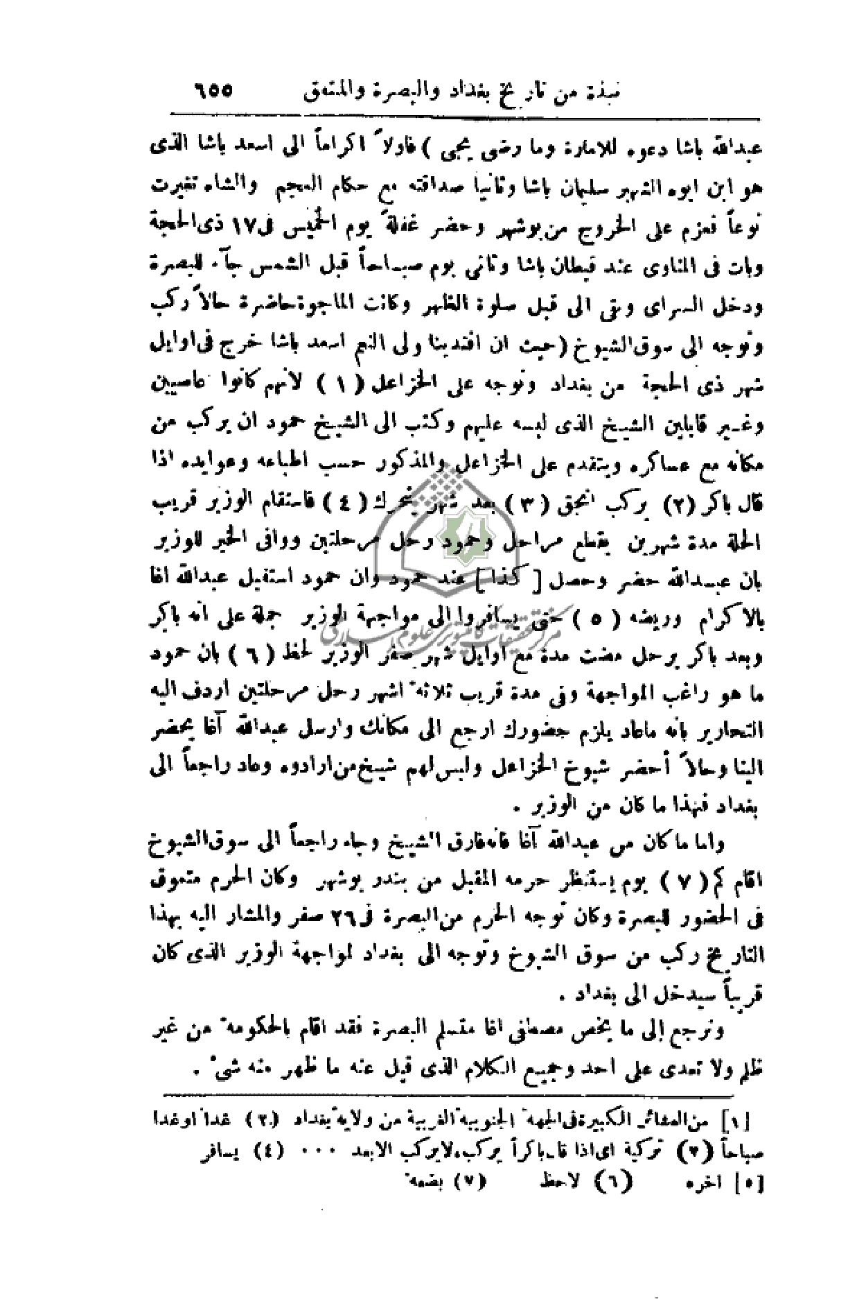 عبد الله باشا دعوه للإمارة وما رضي يجي) فأولاً إكراماً إلى اسعد باشا الذي هو ابن أبوه الشهير سليمان باشا وثانياً صداقته مع حكام العجم والشاه تغيرت نوعاً فعزم على الخروج من بوشهر وحضر غفلةً يوم الخميس في 17 ذي الحجة وبات في المناوي عند قبطان باشا وثاني يوم صباحاً قبل الشمس جاء للبصرة ودخل السراي وبقي إلى قبل صلوة الظهر وكانت الماجورة حاضرة حالاً ركب وتوجه إلى سوق الشيوخ (حيث إن أفندينا ولي النعم اسعد باشا خرج في أوايل شهر ذي الحجة من بغداد وتوجه على الخزاعل لأنهم كانوا عاصيبن وغير قابلين الشيخ الذي لبسه عليهم وكتب إلى الشيخ حمود أن يركب من مكانه مع عساكره ويتقدم على الخزاعل والمذكور حسب طباعه وعوايده إذا قال باكر يركب انجق بعد شهر يتحرك فاستقام الوزير قريب الحلة مدة شهرين يقطع مراحل وحمود رحل مرحلتين ووافى الخبر للوزير بأن عبد الله حضر وحصل (كذا) عند حمود وإن حمود استقبل عبد الله اغا بالإكرام وريضه حتى يسافروا إلى مواجهة الوزير جملة على أنه باكر وبعد باكر يرحل مضت مدة مع أوايل شهر صفر الوزير لحظ بأن حمود ما هو راغب المواجهة وفي مدة قريب ثلاثة أشهر رحل مرحلتين أردف إليه التحارير بأنه ما عاد يلزم