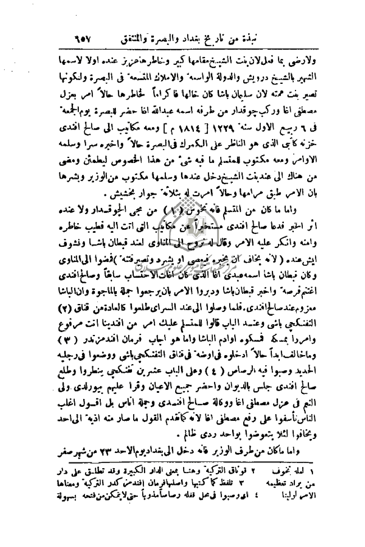 ولا رضي بما فعل لأن بنت الشيخ مقامها كبير وخاطرها عزيز عنده أولاً لأسمها الشهير بالشيخ درويش والدولة الواسعة والأملاك المتسعة في البصرة ولكونها تصير بنت عمته لأن سليمان باشا كان خالها فإكراما لخاطرها حالاُ أمر بعزل مصطفى اغا وركب جوقدار من طرفه اسمه عبد الله اغا حضر للبصرة يوم الجمعة في 6 ربيع الأول سنة 1229 (1814م) ومعه مكاتيب إلى صالح أفندي خزنة كاتبي الذي هو الناظر على الكمرك في البصرة حالاً وأخبره سرا وسلمه الموامر ومعه مكتوب للمتسلم ما فيه شيء من هذا الخصوص ليطمئن ومضى من هناك إلى عند بنت الشيخ دخل عندها وسلمها مكتوب من الوزير وبشرها بأن الأمر طبق مرامها وحالاً أمرت له بثلاثة جوار بخشيش.
