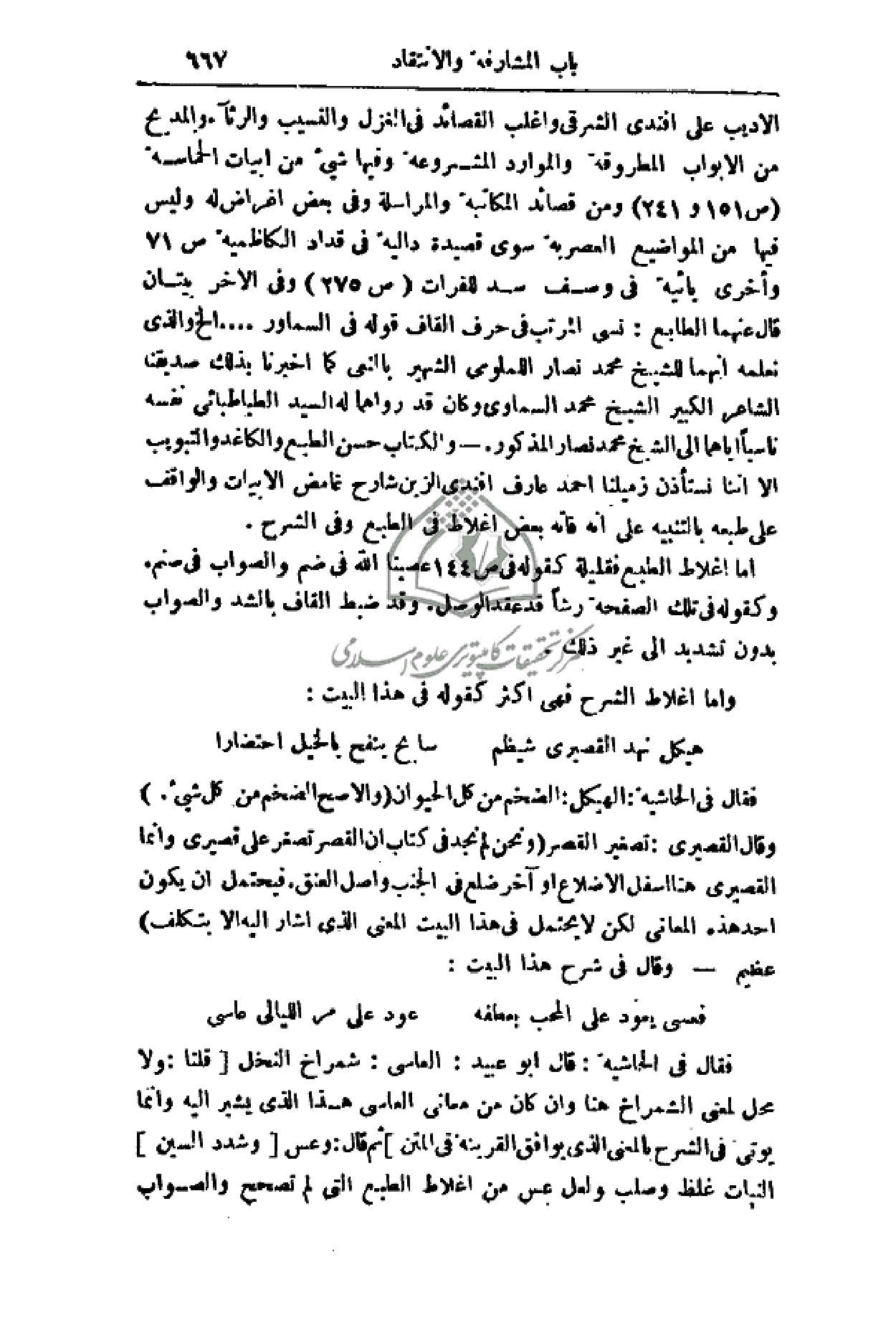 فقال في الحاشية: الهيكل: الضخم من كل الحيوان (والأصح الضخم من كل شيء.) وقال القصيري: تصغير القصر (ونحن لم نجد في كتاب أن القصر تصغر على قصيري وإنما القصيري هنا أسفل الأضلاع أو آخر ضلع في الجنب وأصل العنق. فيحتمل أن يكون أحد هذه المعاني لكن لا يحتمل في هذا البيت المعنى الذي أشار إليه إلا بتكلف)