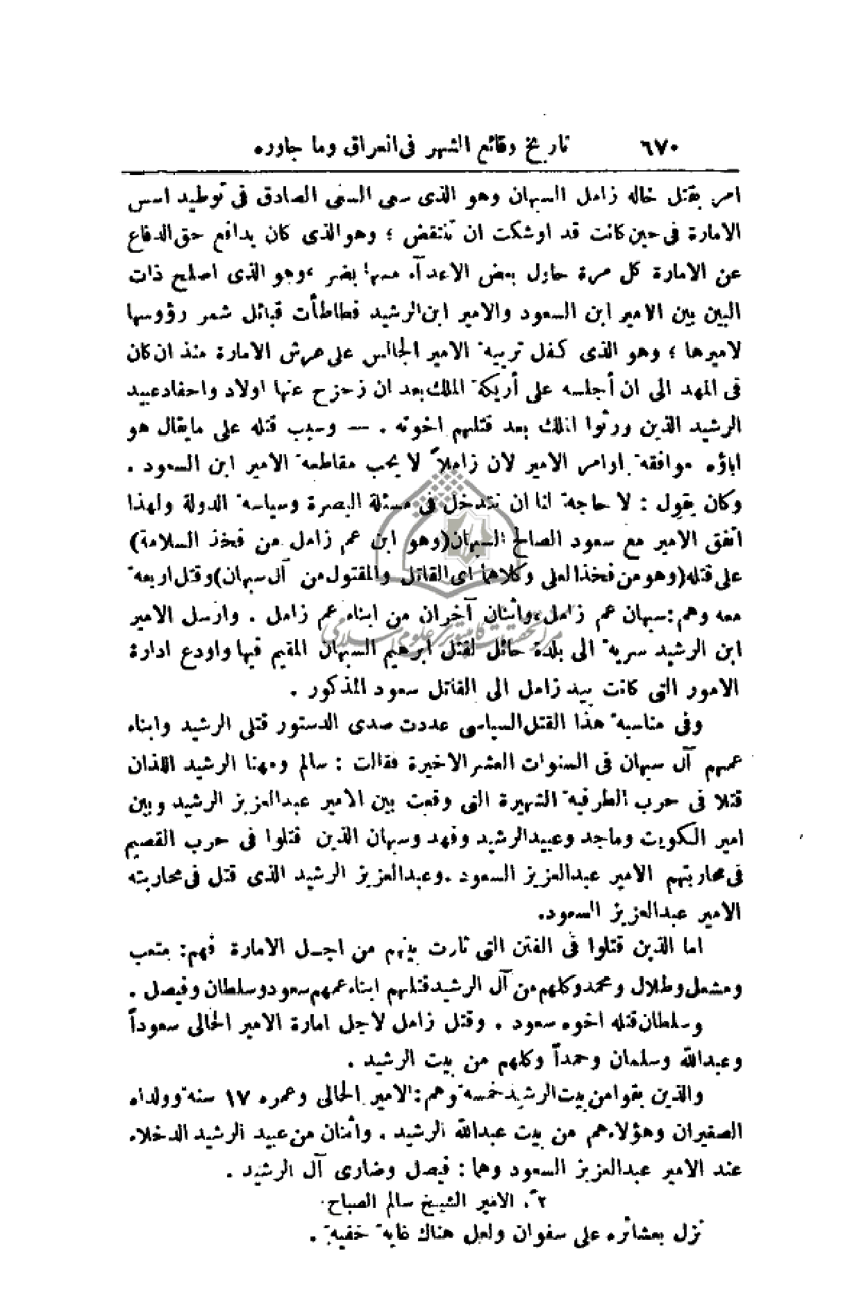 أما الذين قتلوا في الفتن التي ثارت بينهم من أجل الإمارة فهم: متعب ومشعل وطلال ومحمد وكلهم من آل الرشيد قتلهم أبناء عمهم سعود وسلطان وفيصل. وعبد الله وسلمان وحمداً وكلهم من بيت الرشيد.