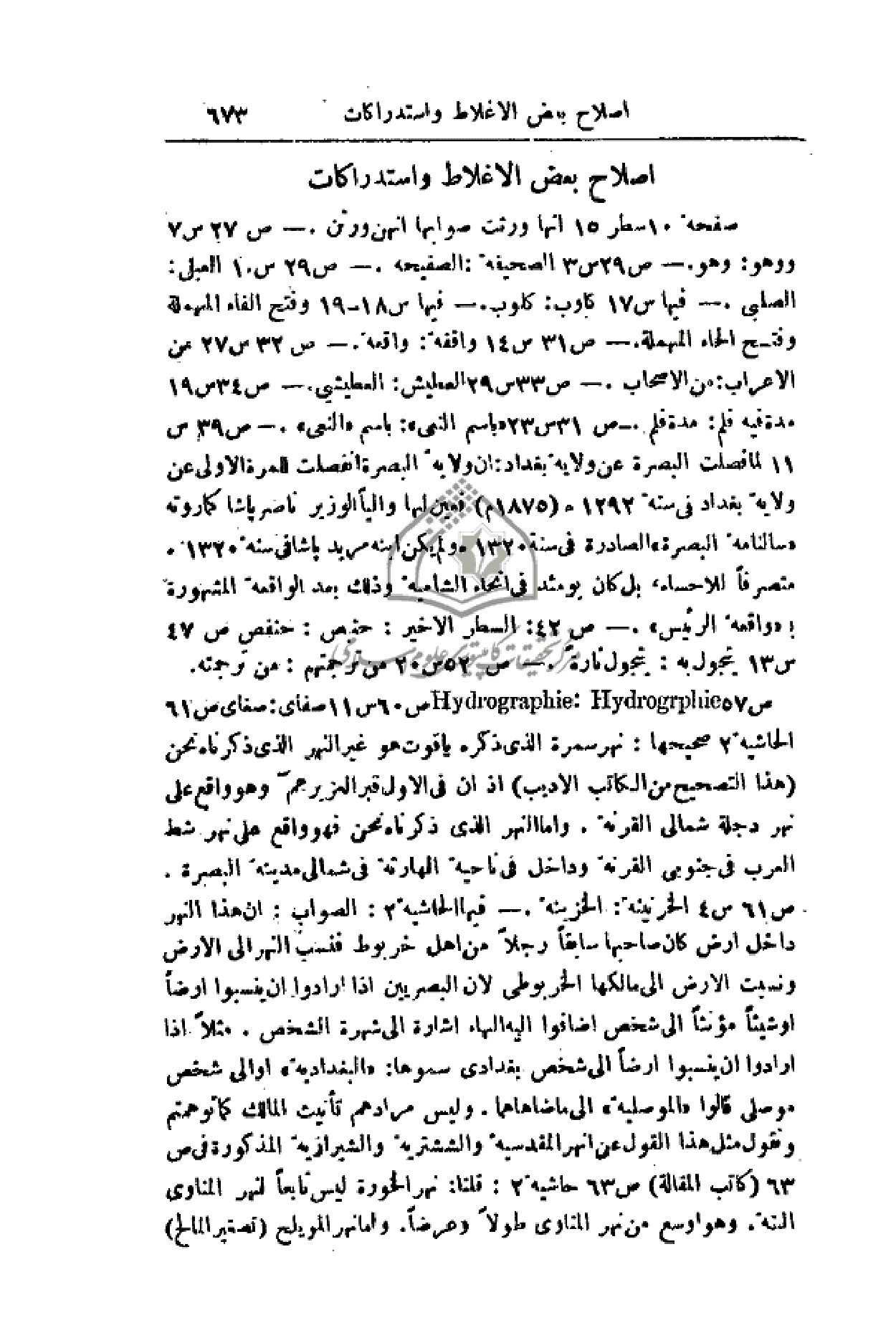 صفحة 10 سطر 15 أنها ورثت صوابها أنهن ورثن. - ص 27 س 7 ووهو: وهو. - ص 29 س 3 الصحيفة: الصفيحة. - ص 29 س 10 العبلى: الصبلى - فيها س 17 كاوب: كلوب - فيها س 18 - 19 وفتح الفاء المهملة وفتح الحاء المهملة. - ص 31 س 14 واقفة: واقعة. - ص 32 س 27 من الأعراب: من الأصحاب. - ص 33 س 29 العطيش: العطيشي. - ص 34 س 19 مدة فيه فلم: مدة فلم. - ص 31 س 23 (باسم النعى): باسم (النعي). - ص 39 س 11 لما فصلت البصرة عن ولاية بغداد: إن ولاية البصرة انفصلت للمرة الأولى عن ولاية بغداد في سنة 1292هـ (1875م) فعين لها والياً الوزير ناصر باشا كما روته (سالنامة البصرة) الصادرة في سنة 1320هـ ولم يكن ابنه مزيد باشا في سنة 1320. متصرفاً للأحساء؛ بل كان يومئذ في أنحاء الشامية وذلك بعد الواقعة المشهورة ب (واقعة الرئيس). - ص 42: السطر الأخير: حنبص: حنفص ص 47 س 13 يتجول به: يتجول تارةٍ. - ص 52 س 20 من ترجمتهم: من ترجمته. ص 57 ص 60 س 11 صفاى: صغاى ص 61 الحاشية 2 صحيحها: نهر سمرة الذي ذكره ياقوت هو غير النهر الذي ذكرناه نحن (هذا التصحيح من الكاتب الأديب) إذ أن في الأول قبر العزيز عم وهو واقع على نهر دجلة شمالي القرنة. وأما النهر الذي ذكرناه نحن فهو واقع على نهر شط العرب في جنوبي القرنة وداخل في ناحية الهارثة في شمالي مدينة البصرة. ص 61 س 4 الخرنينة: الخزينة - فيه الحاشية 2: الصواب: إن هذا النهر داخل أرض كان صاحبها سابقاً رجلاً من أهل خربوط فنسب النهر إلى الأرض ونسبت الأرض إلى مالكها الخربوطي لأن البصريين إذا أرادوا أن ينسبوا أرضاً أو شيئاً مؤنثاً إلى شخص أضافوا إليه الهاء إشارة إلى شهرة الشخص. مثلاً إذا أرادوا أن ينسبوا أرضاً إلى شخص بغدادي سموها: (البغدادية) أو إلى شخص موصلي قالوا (الموصلية) إلى ما ضاهاهما. وليس مرادهم تأنيث المالك كما توهمتم ونقول مثل هذا القول عن أنهر المقدسية والششترية والشيرازية المذكورة في ص 63 (كانت المقالة) ص 63 حاشية 2: قلناه نهر الخورة ليس تابعاً لنهر المناوي البتة. وهو أوسع من نهر المناوي طولاً وعرضاً. وأما نهر المويلح (تصغير المالح).
