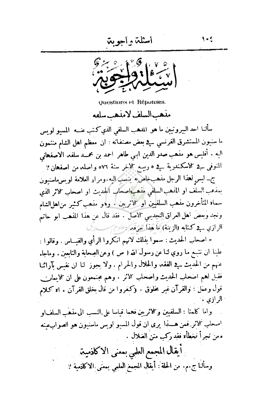 سألنا أحد البيروتيين ما هو المذهب السلفي الذي كتب عنه المسيو لويس ماسنيون المستشرق الفرنسي في بعض مصنفاته: إن معظم أهل الشام منتمون إليه. أفليس هو مذهب صدر الدين أبي طاهر احمد بن محمد سلفه الاصفهاني المتوفى في الإسكندرية في 5 ربيع الأخر سنة 576 وأصله من اصفهان؟
