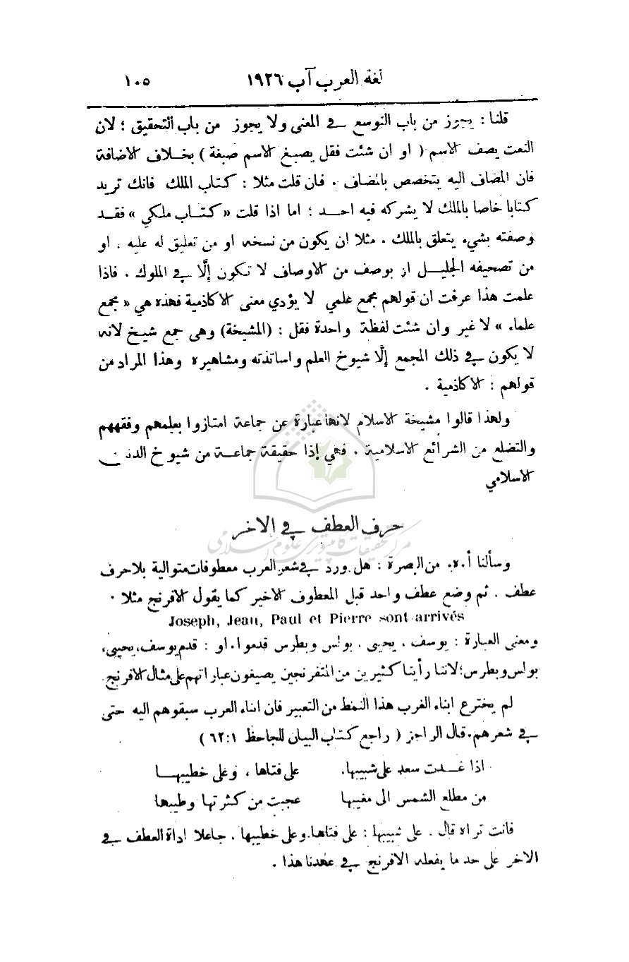 فأنت تراه قال. على شبيبها؛ على فتاها، وعلى خطيبها، جاعلا أداة العطف في الأخر على حد ما يفعله الإفرنج في عهدنا هذا.