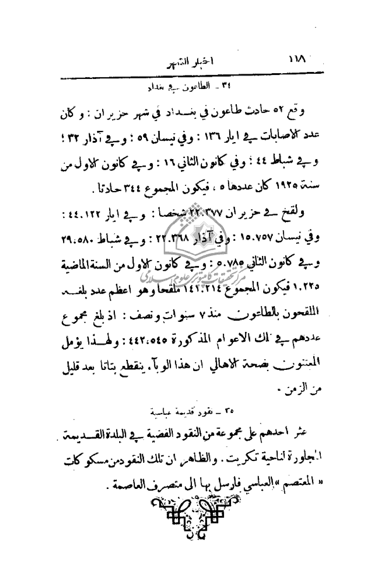 وقع 52 حادث طاعون في بغداد في شهر حزيران؛ وكان عدد الإصابات في أيار 136؛ وفي نيسان 59؛ وفي آذار 32؛ وفي شباط 44؛ وفي كانون الثاني 16؛ وفي كانون الأول من سنة 1925 كان عددها 5، فيكون المجموع 344 حادثا.