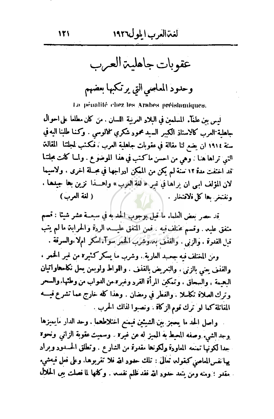 ليس بين علماء المسلمين في البلاد العربية اللسان. من كان مطلعا على أحوال جاهلية العرب كالأستاذ الكبير السيد محمود شكري الالوسي. وكنا طلبنا إليه في سنة 1914 أن يضع لنا مقالة في عقوبات جاهلية العرب، فكتب لمجلتنا المقالة التي تراها هنا. وهي من أحسن ما كتب في هذا الموضوع. ولما كانت مجلتنا قد اختفت مدة 12 سنة لم يكن من الممكن إدراجها في مجلة أخرى، ولا سيما لأن المؤلف آبى أن يراها في غير (لغة العرب) ولهذا نزين بها جيدها. ونفتخر بها كل الافتخار.